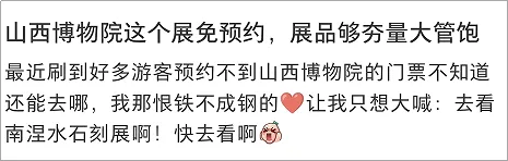 网友“Houdini”称此次展览是“一场跨越古今的伯乐寻驹之旅”。网友“LULU刘”也感慨:“都说千里马不常有,但山西真的有很多。始于伙伴,终于图腾。” 网友“山佑人文”则称赞这场展览的策展视角:“不是你‘观’文物,而是你化身‘伯乐’主动‘相马’,每匹马都在等你读懂它的灵魂。”