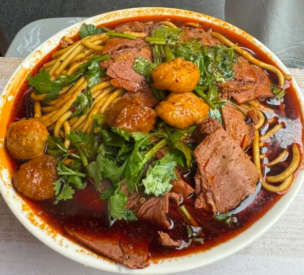 牛肉丸子面做法不复杂,先把牛肉剁细,加葱姜和调料打成丸子,下锅煮到定型。另起汤底,用辣子、骨汤和少许醋提味,面煮好后连汤带丸子一起浇上去。关键不在猛辣,而在那口鲜香,喝一口,身上就热了。