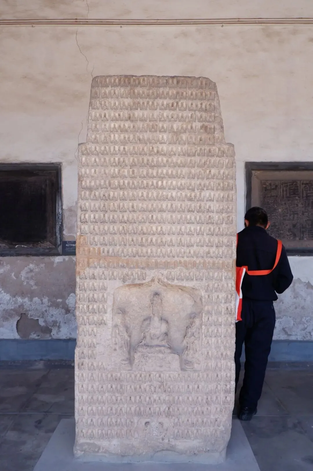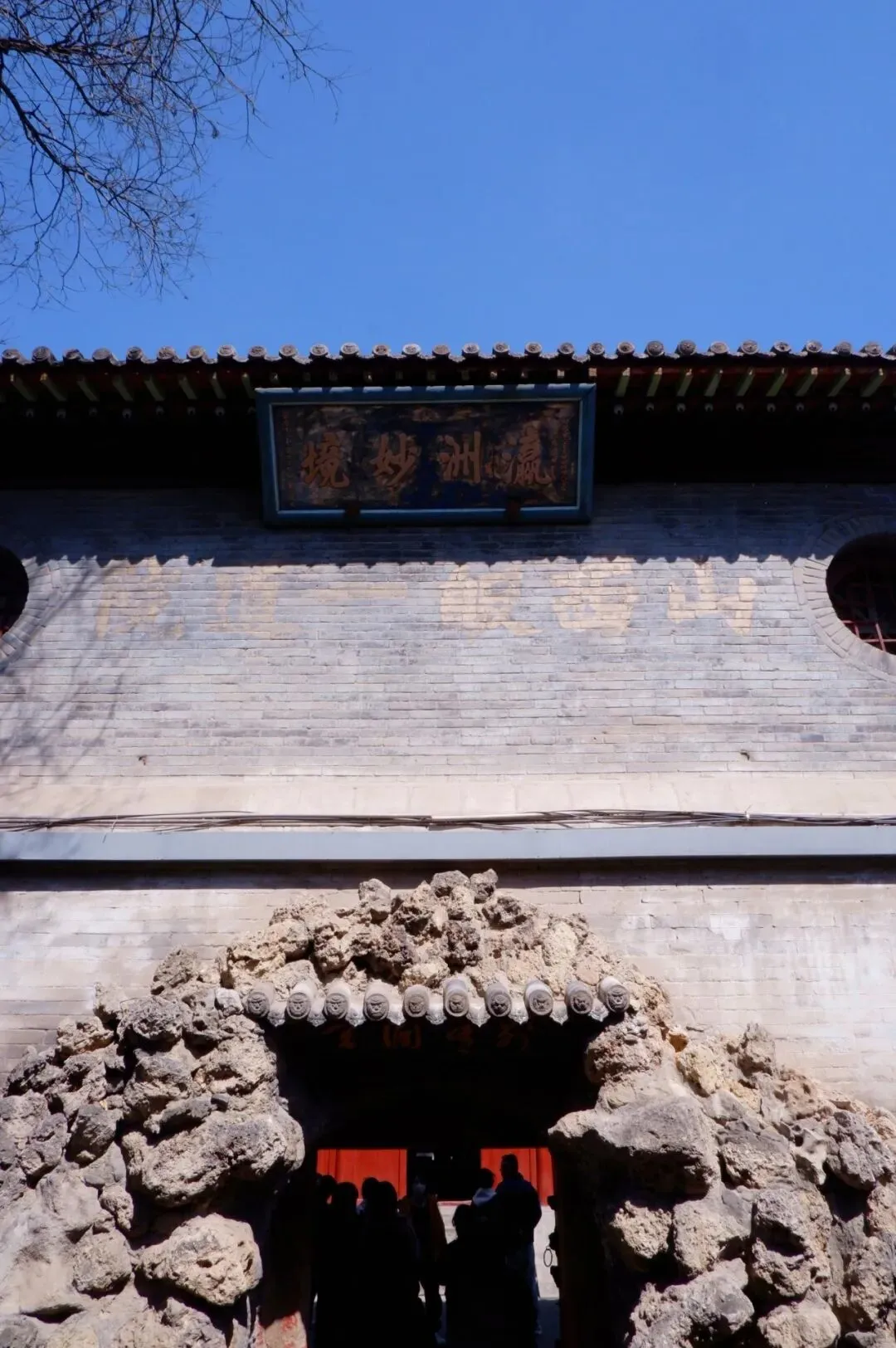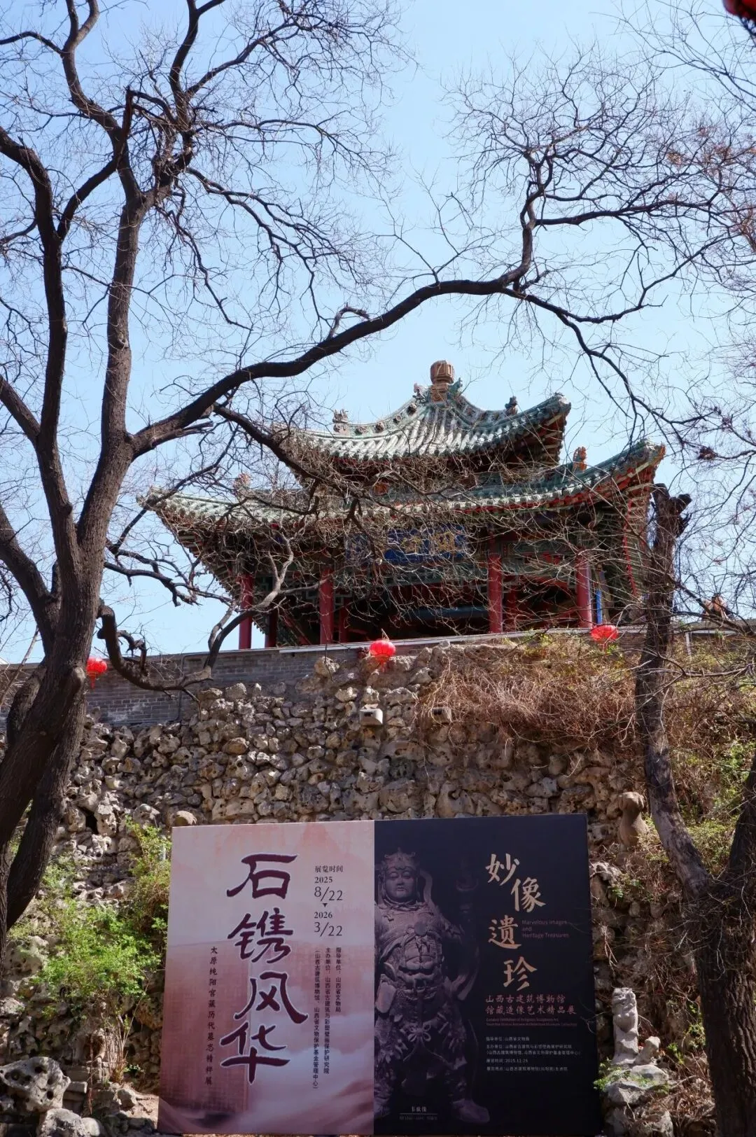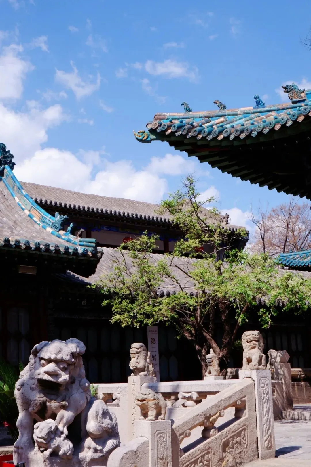 一进去,整个氛围就宁静下来。左手是碑廊,右手是假山,正前方是吕天仙祠的牌匾。我坐在碑廊旁休息会儿,看着这个季节的古木,还没有长出很多新芽,枝干遒劲有力的生长姿势,是一种穿越历史的力量。天空湛蓝如洗,鸟巢安然地在高处,平稳地保护着这里的生灵。鸟鸣清脆,一声声啁啾动人——后来才发现,原是门口挂着几笼彩色小鸟,不知道是不是刻意养着,要为这静谧添了几分活跃的色彩和鸣叫。我还没休息够,就被一位志愿者的讲解吸引,听着她讲碑上刻着的道教符文、涅槃变相碑的故事、傅山的行草书法碑……跟着讲解口中的一个个故事,我明白有些体验是照片视频永远无法代替的,身临其境在碑刻中游览,在一个个或虚构或真实的故事里周游。我仿佛一会儿到了唐朝武则天的大云寺,一会儿又立在佛的脚下仰望,一会儿又回到现代。