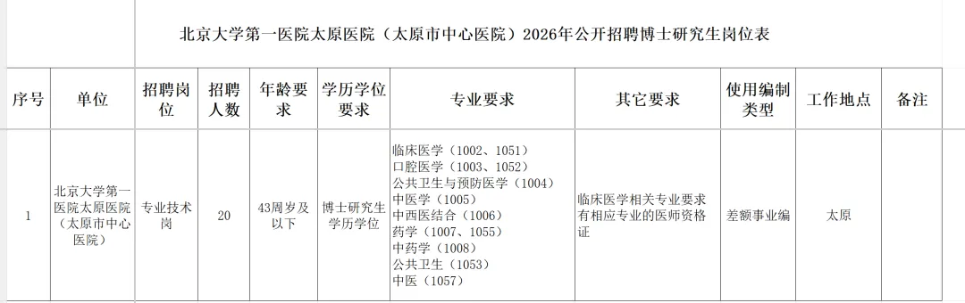 2026年公开招聘博士研究生20名,均为专业技术岗。招聘岗位所需的具体条件以《北京大学第一医院太原医院(太原市中心医院)2026年公开招聘博士研究生岗位表》(附件)的要求为准。