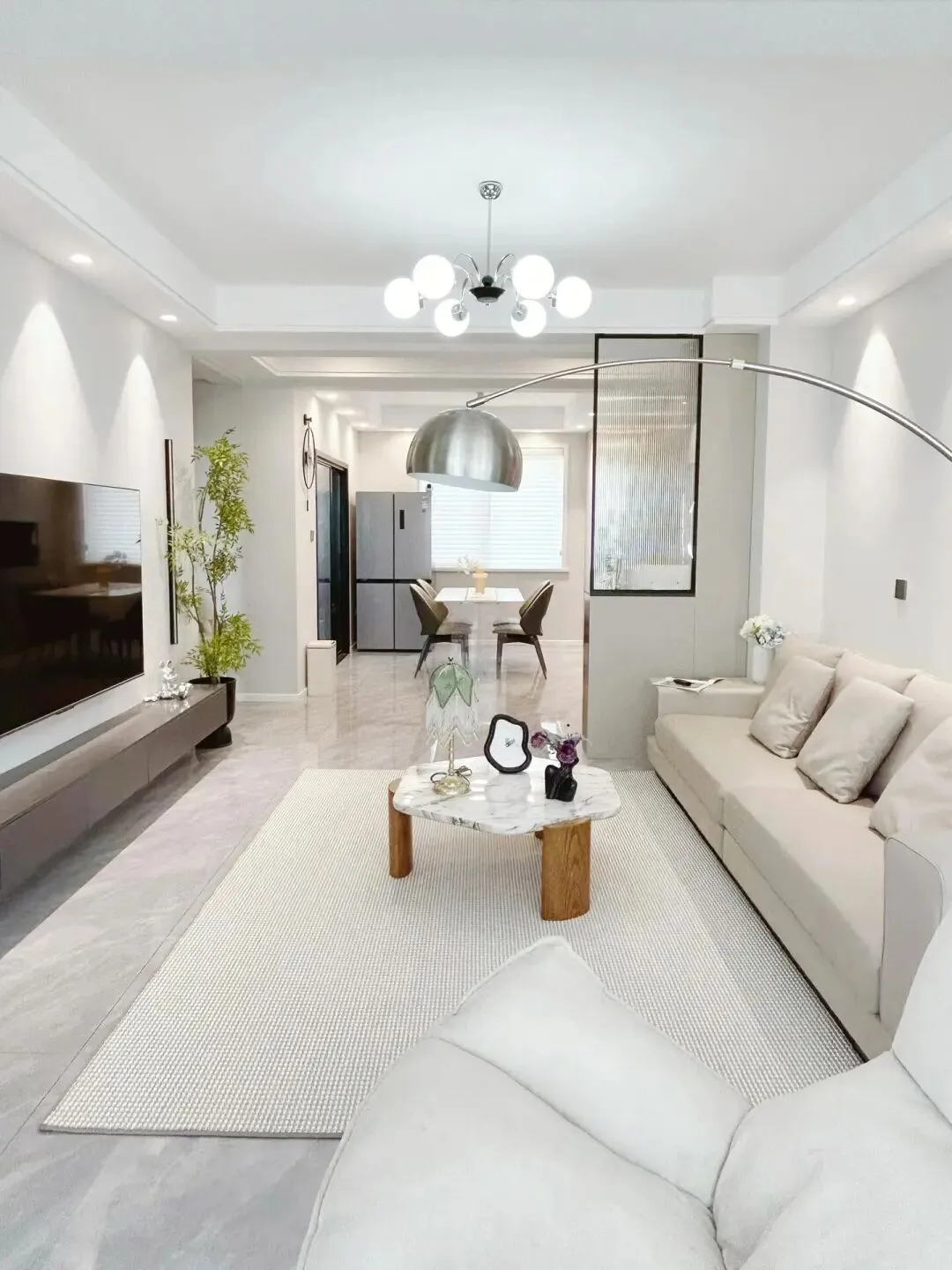 极简,是宋氏美学的表象。 它摒弃了繁复的雕花、厚重的吊顶和艳俗的色彩。在肖邦家居的实景案例中,我们看到的是大面积的留白,是利落的线条,是通透的空间布局。墙面多采用米灰、杏子灰等低饱和度色彩,地面通铺温润的木地板或柔光砖,视觉上极度干净。这种极简,让大平层的空间感得到了最大化的释放,让光线和空气在室内自由流动。