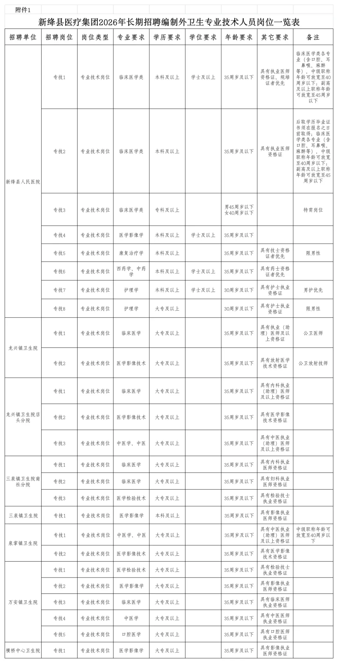 附件1:《新绛县医疗集团2026年长期招聘编制外卫生专业技术人员岗位一览表》;