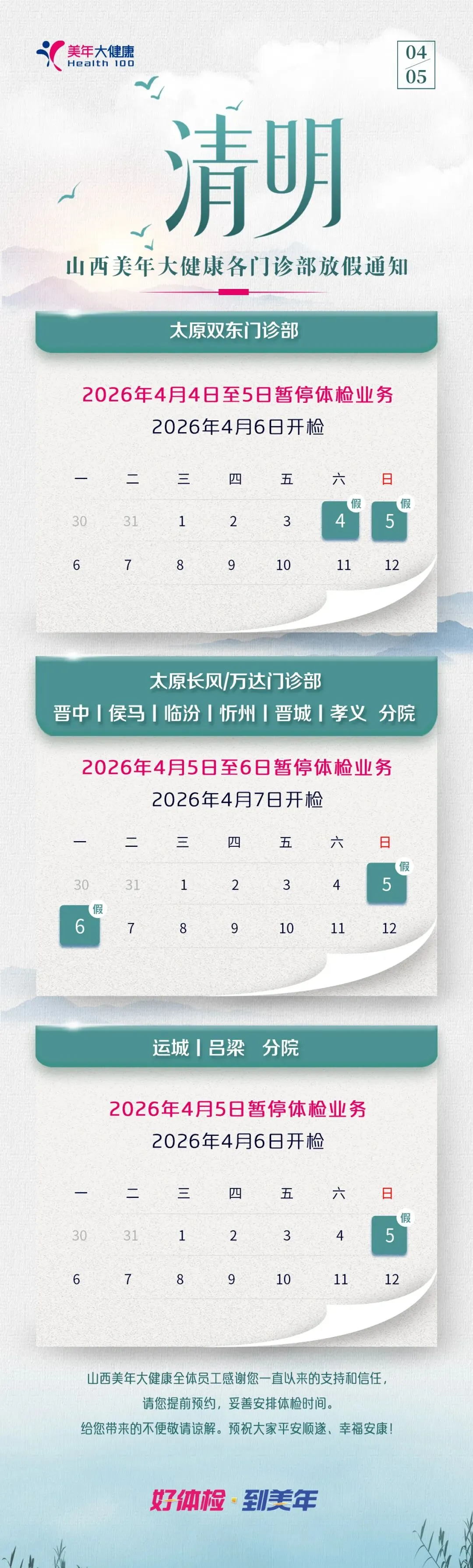 春和景明,万物生晖。值此清明佳节来临之际,山西美年大健康衷心向您致以诚挚的问候,感谢您一直以来的信赖与陪伴。为便于您提前规划体检行程,现将2026年清明节期间各门诊部的放假安排告知如下: