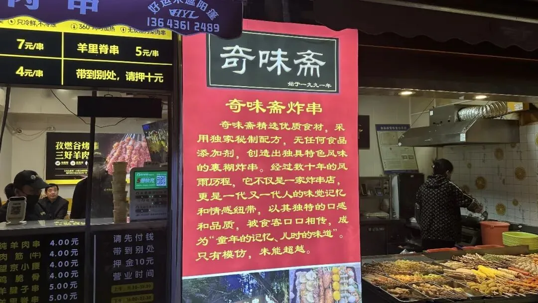 炸串两家:江南是老城区的童年,奇味斋是老军营的排队王。煮串找胜群,沾串站胖姐,烤串蹲吕厨。