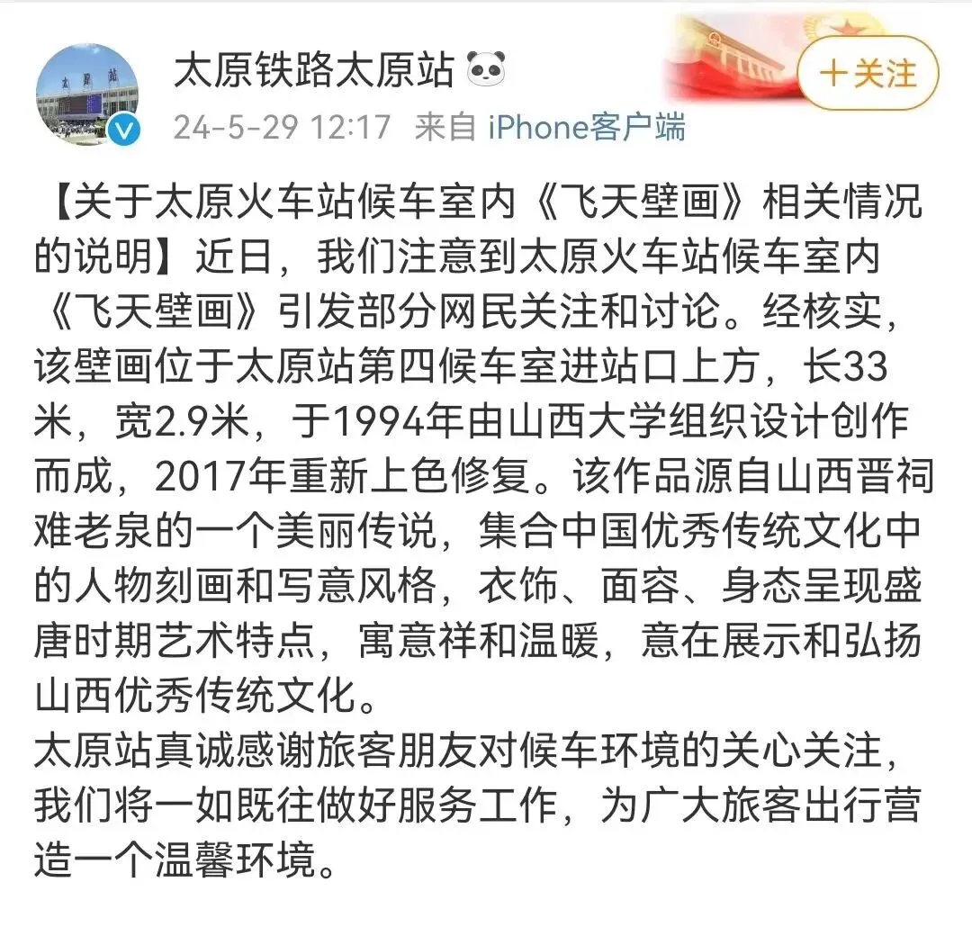 对于网上的争议,太原铁路局太原站发文进行解释说明。文中表示,太原站注意到太原火车站候车室内《飞天壁画》引发部分网民关注和讨论。经核实,该壁画位于太原站第四候车室进站口上方,长33米,宽2.9米,于1994年由山西大学组织设计创作而成,2017年重新上色修复。太原站表示,该作品源自山西晋祠难老泉的一个美丽传说,集合中国优秀传统文化中的人物刻画和写意风格,衣饰、面容、身态呈现盛唐时期艺术特点,寓意祥和温暖,意在展示和弘扬山西优秀传统文化。“真诚感谢旅客朋友对候车环境的关心关注,我们将一如既往做好服务工作,为广大旅客出行营造一个温馨环境。”太原站称。