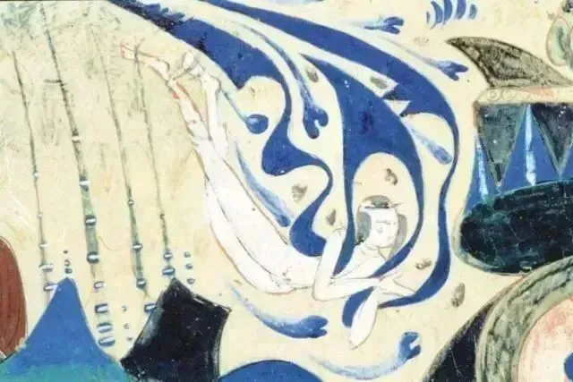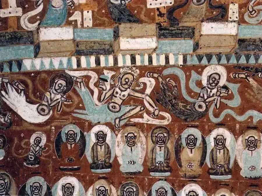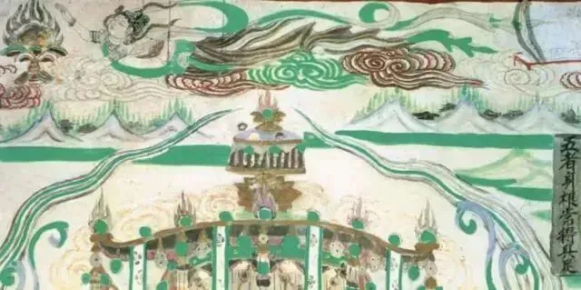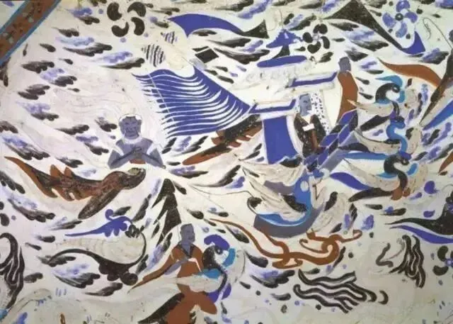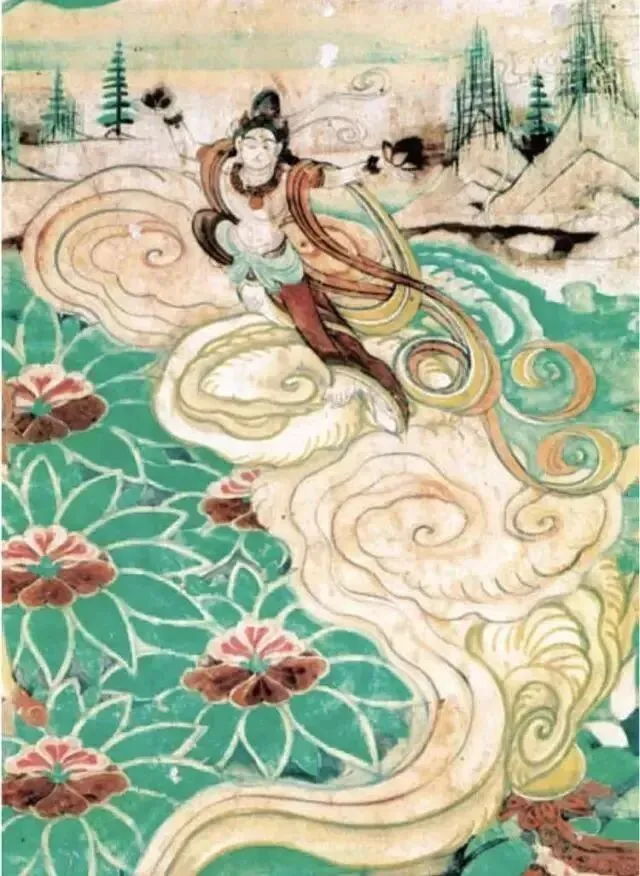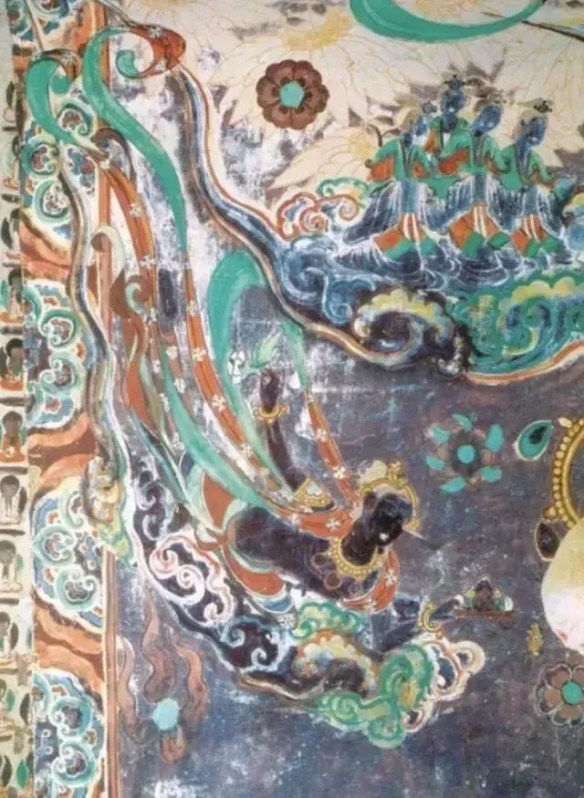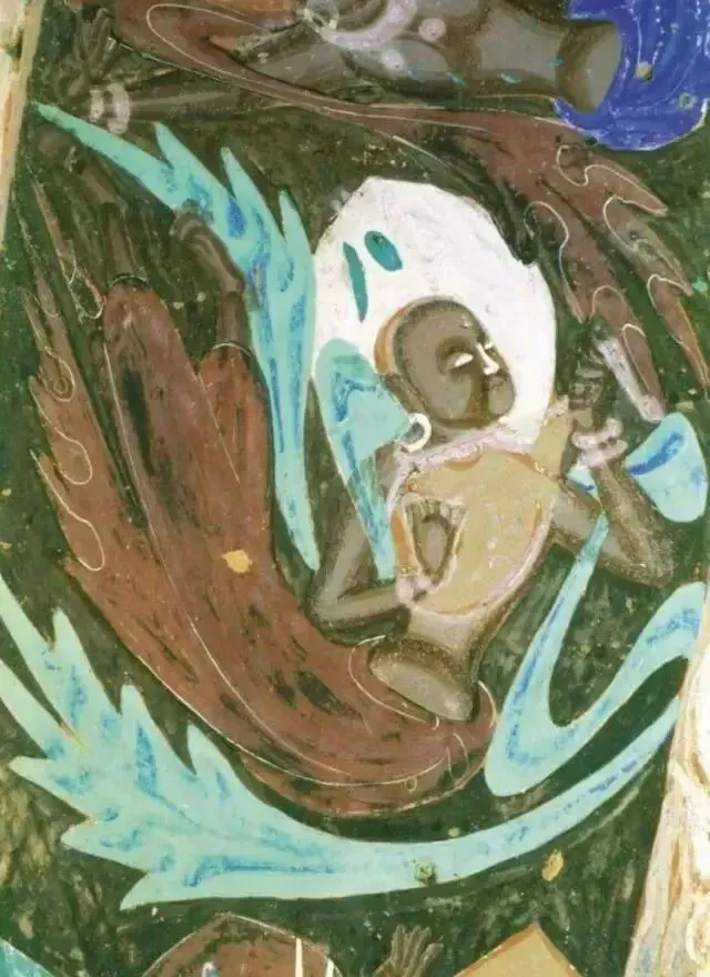 此时飞天的造型,无论脸型还是服饰,均吸取了西域画法。其造型简朴,多为男性,似西方僧侣模样;用扭曲的身体来表示飞舞,多呈“U”字形。