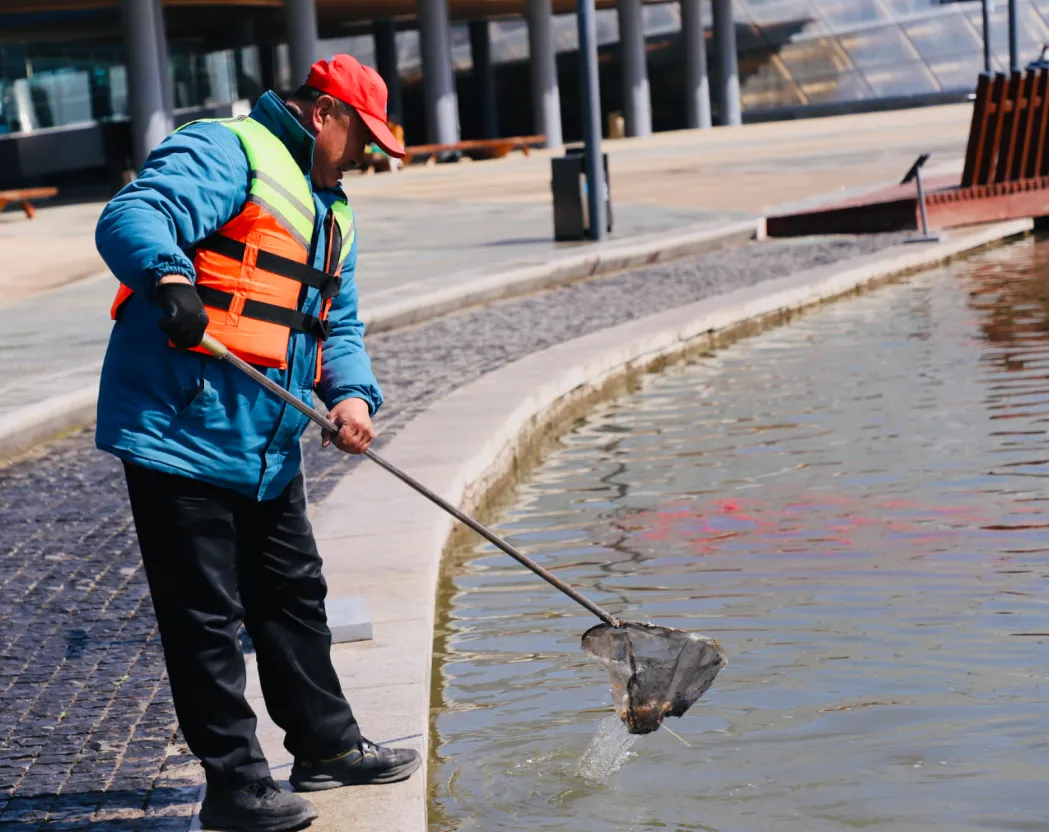 湖面上,打捞人员手持捞网,仔细地清理着水中的杂物,无论是漂浮的落叶还是细小的垃圾,都被一一清除,让湖水保持清澈见底。而在园区各处,保洁人员还细致地擦洗着垃圾桶,确保这些公共设施不仅外观整洁,内部也干净无异味。