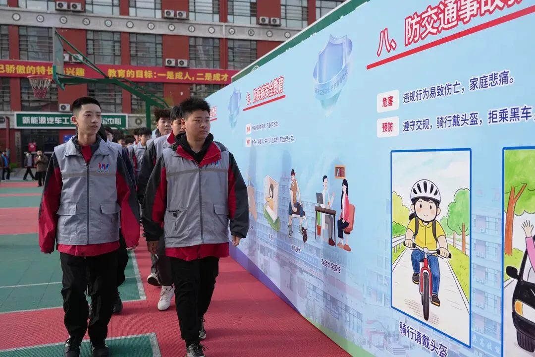 校领导与全体师生依次有序走过展示墙,认真阅读学习各项安全知识。通过直观的展示与讲解,师生们对校园欺凌、网络诈骗、消防安全、交通出行等方面的风险隐患有了更加清晰的认识,进一步掌握了基本的应对方法与处置技能。