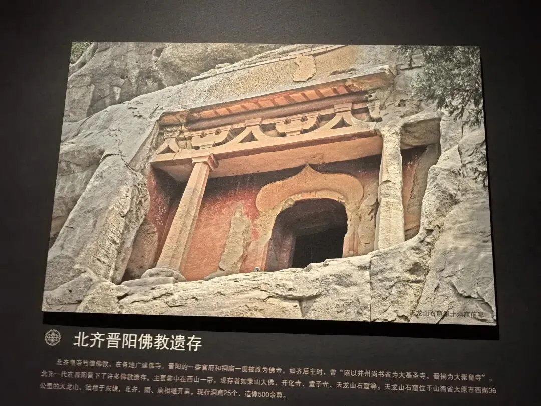 北齐皇帝笃信佛教,在各地广建佛寺。晋阳的一些官府和祠庙一度被改为佛寺,如齐后主时,曾"诏以并州尚书省为大基圣寺,晋祠为大崇皇寺"。北齐一代在晋阳留下了许多佛教遗存,主要集中在西山一带,现存者如蒙山大佛、开化寺、童子寺、天龙山石窟等。天龙山石窟位于山西省太原市西南36公里的天龙山,始凿于东魏,北齐、隋、唐相继开凿,现存洞窟25个、造像500余尊。