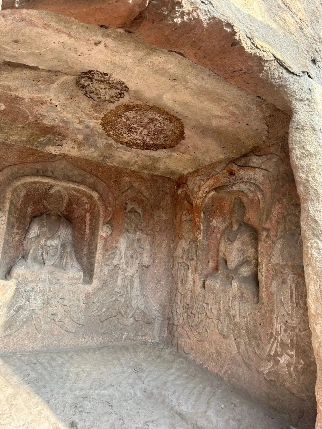 中间和左侧的造像。据说石窟壁上刻有“延昌三年八月十五,石窟主郭广兴等”字样,显示石窟开凿于北魏延昌三年(公元514年),比云冈石窟晚50多年,距今已有1500多年的历史。网上说,这座石窟是太原市范围内已知开凿时间最早的,填补了山西石窟寺研究的时间坐标。在这么偏僻的地方,有这样一座雕像精美、有确切开凿时间、保存相对完好的石窟,真是不容易啊。也印证了那句话:“高手在民间”。古代的能工巧匠太了不起了。
