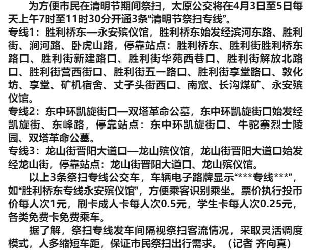 >4月3日至5日,太原开通三条祭扫公交专线