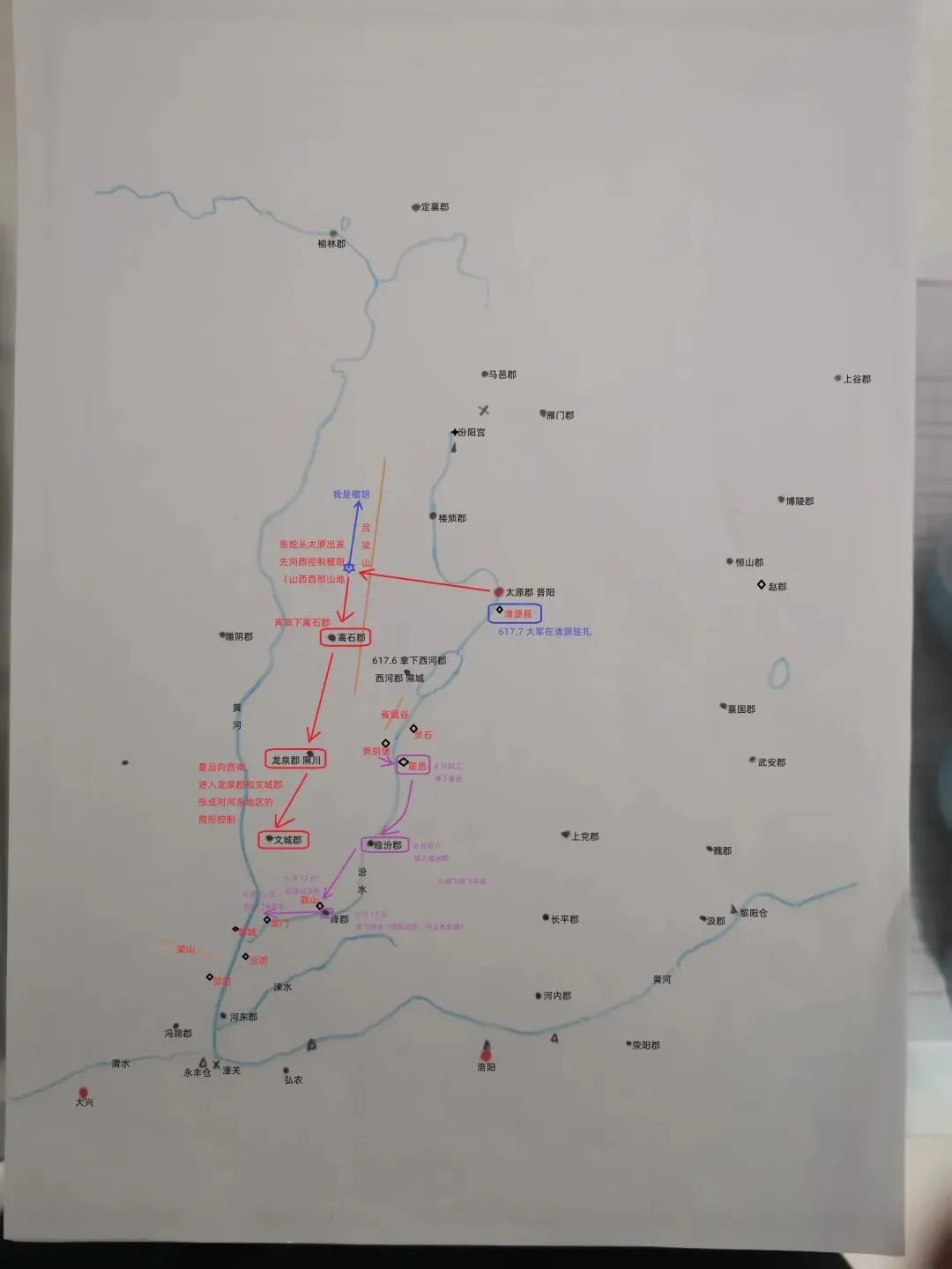 8月初八,李渊带兵进了临汾郡。进城之后,对郡里的官员百姓,李渊也一样慰问安抚,量才任用,和在霍邑的时候做法一样。(图1紫色)