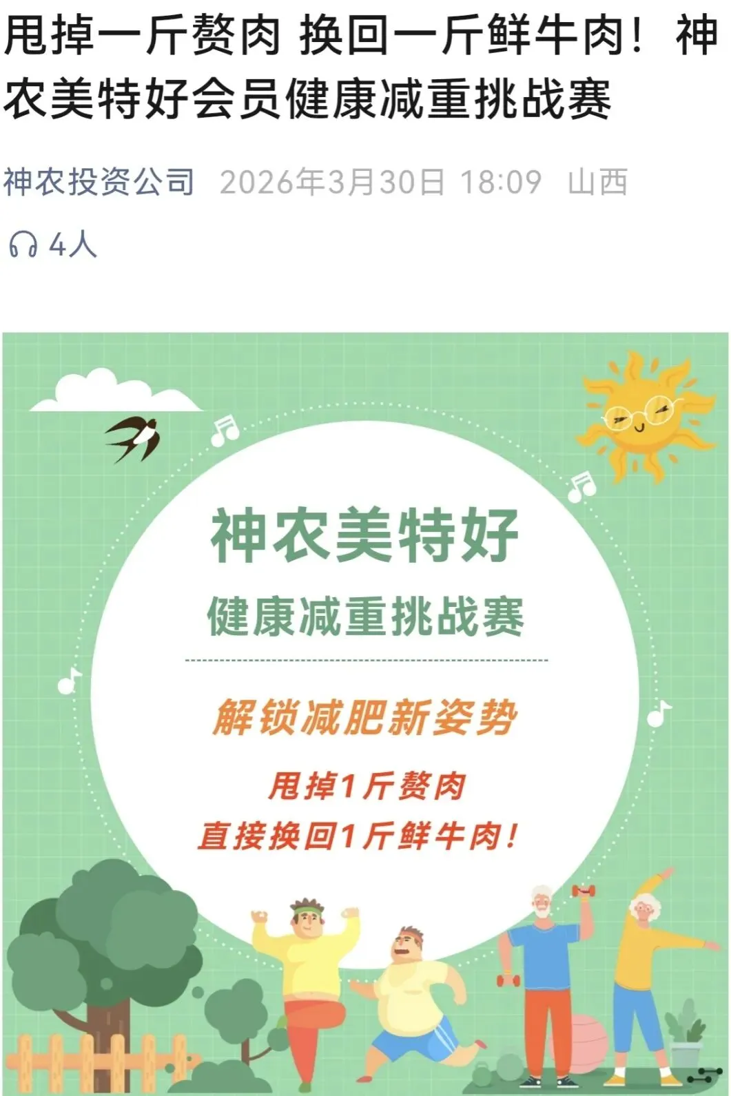 3月30日,神农投资公司官方公众号官宣:《神农美特好会员健康减重挑战赛》