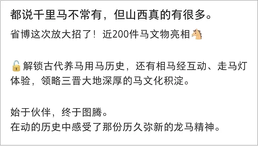 网友“Houdini”称此次展览是“一场跨越古今的伯乐寻驹之旅”。网友“LULU刘”也感慨:“都说千里马不常有,但山西真的有很多。始于伙伴,终于图腾。” 网友“山佑人文”则称赞这场展览的策展视角:“不是你‘观’文物,而是你化身‘伯乐’主动‘相马’,每匹马都在等你读懂它的灵魂。”