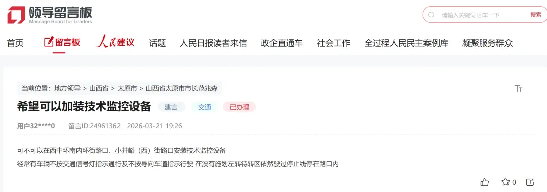 记者从人民网领导留言板获悉,网友建议在太原市西中环南内环街路口、小井峪(西)街路口安装技术监控设备。