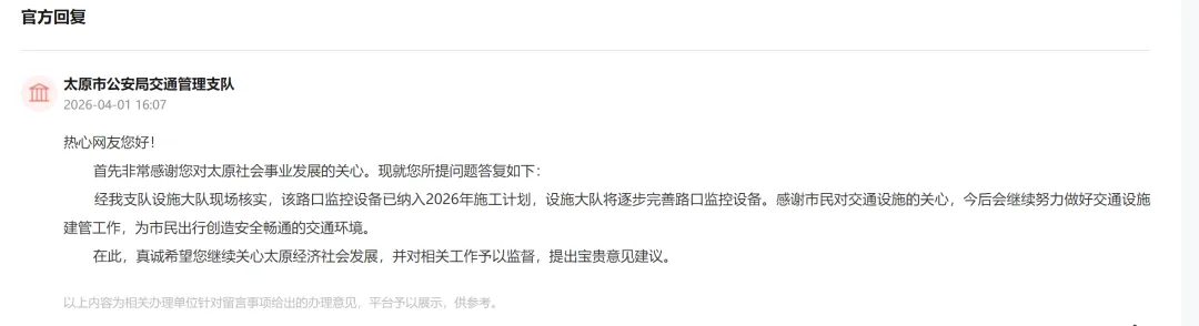 网友建议在太原市这些路口加装监控,官方:已纳入计划!