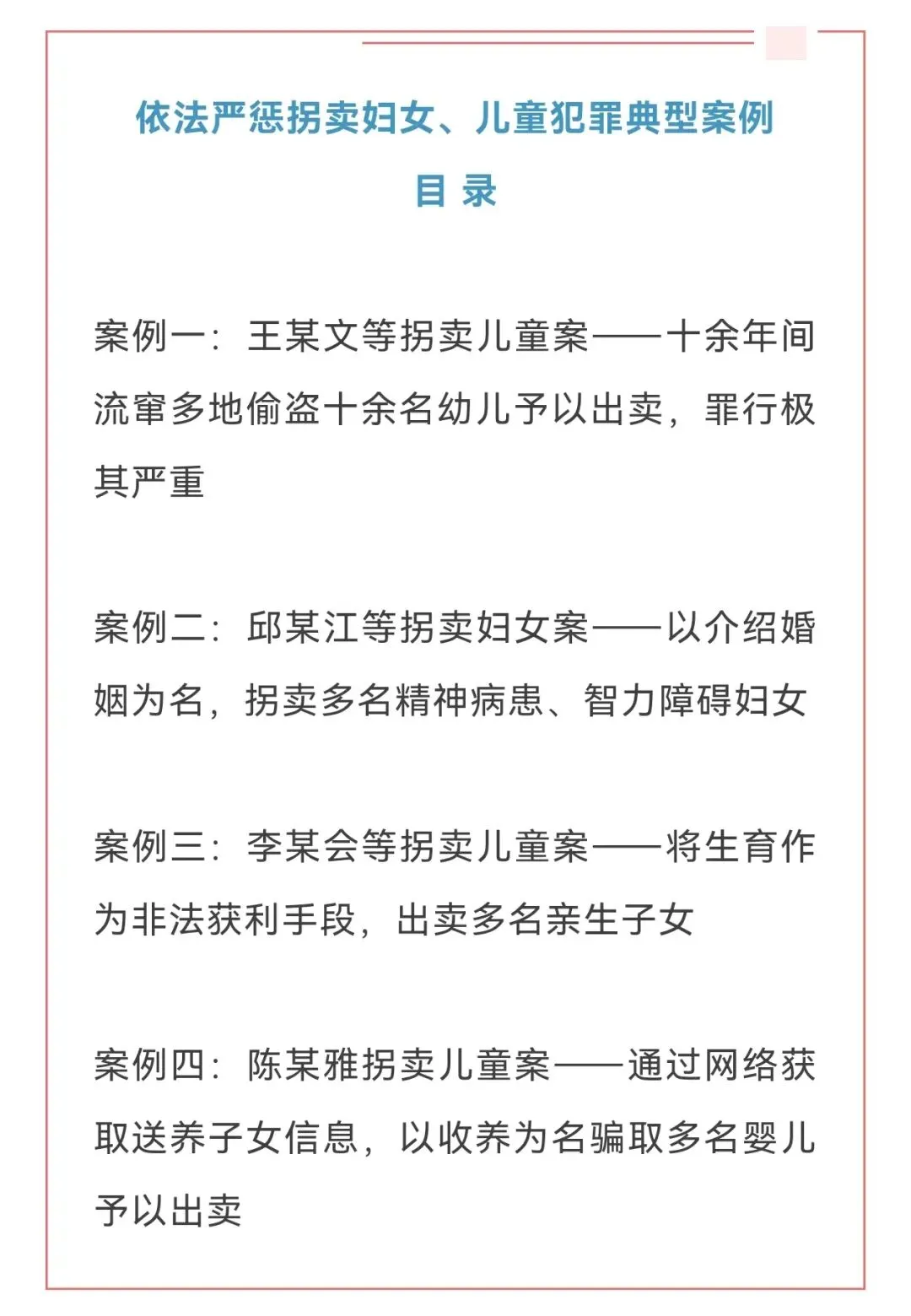 1.最高人民法院发布依法严惩拐卖妇女、儿童犯罪典型案例:为进一步彰显人民法院依法严惩拐卖犯罪,切实维护妇女儿童合法权益的坚定决心,充分发挥典型案例的警示教育、法治引领、办案指导等作用,最高人民法院近日选取了四件依法严惩拐卖妇女、儿童犯罪典型案例予以发布。(最高人民法院)