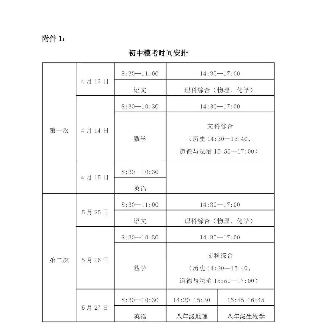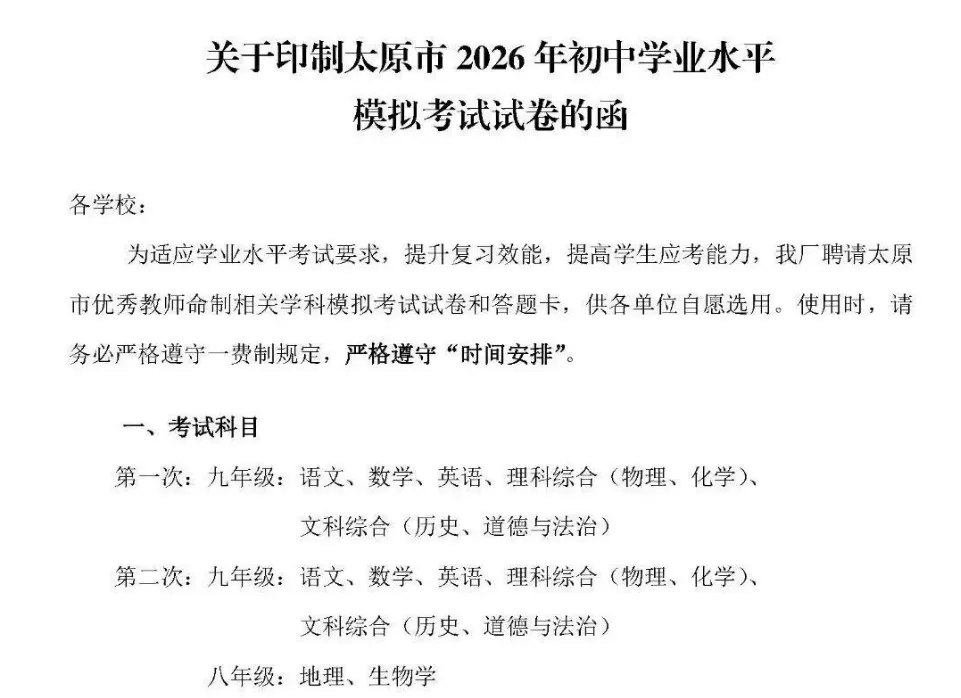 2026年太原市中考一模二模考试时间(含生物、地理)公布