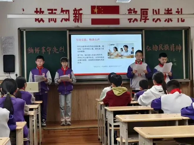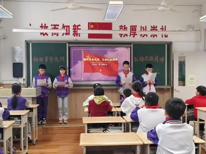 升旗仪式结束后,全校各班级同步开展“缅怀革命先烈,弘扬民族精神”主题班会,其中五年二班精心组织了主题班队会展示活动,通过沉浸式红色教育,让革命精神深深浸润每一颗稚嫩的童心。