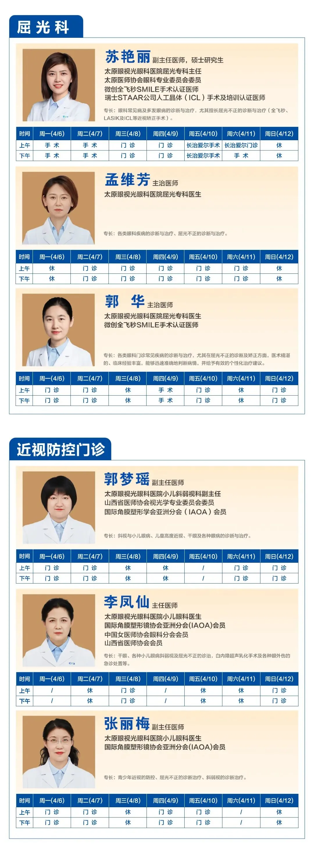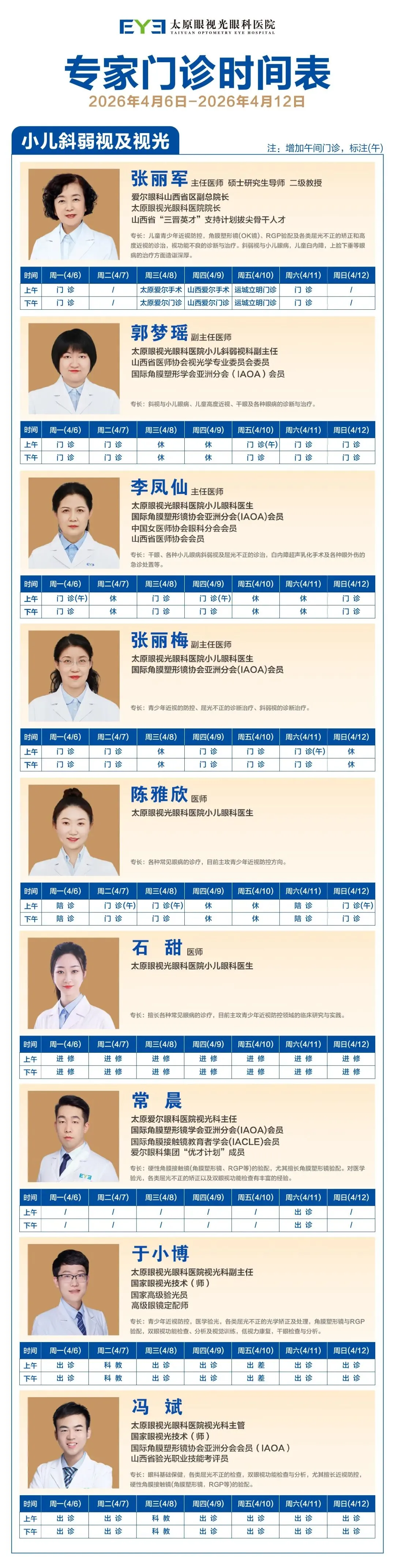 太原眼视光眼科医院 2026年4月6日 - 2026年4月12日门诊排班表