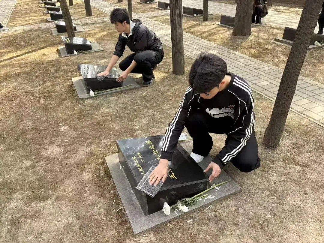 仪式结束后,同学们分组前往英烈墓区,用抹布仔细擦拭墓碑。在指尖与石碑的触碰中,大家铭记每一个滚烫的名字,铭记那些为国家献出的青春与信仰。祭扫活动尾声,师生们有序参观太原解放纪念馆及英烈事迹陈列区,驻足观看珍贵的历史照片与革命文物,认真聆听革命先辈浴血奋战的英雄事迹,重温太原解放战役的峥嵘岁月,深刻感悟先烈们不畏牺牲、忠诚报国的崇高精神。活动最后,全体成员在烈士纪念碑前与院旗合影,将这堂“行走的思政课”永远定格。