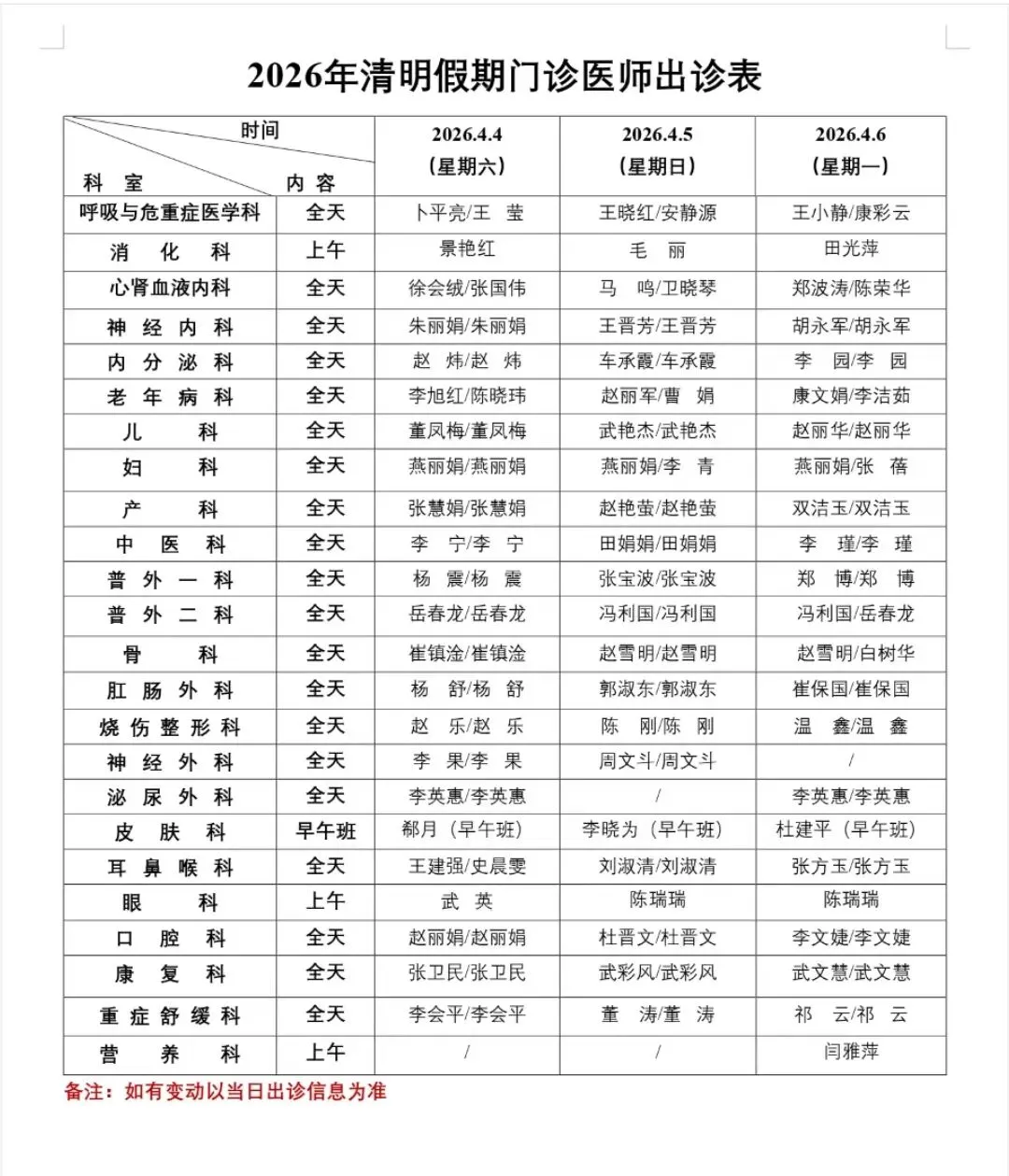 人间四月芳菲日,桃花烟雨清明时。根据国家法定节假日安排,今年清明节放假时间为4月4日(星期六)至4月6日(星期一)共计3天。为满足广大门诊患者的就医需求,太原市第二人民医院“清明节”门诊出诊安排如下: