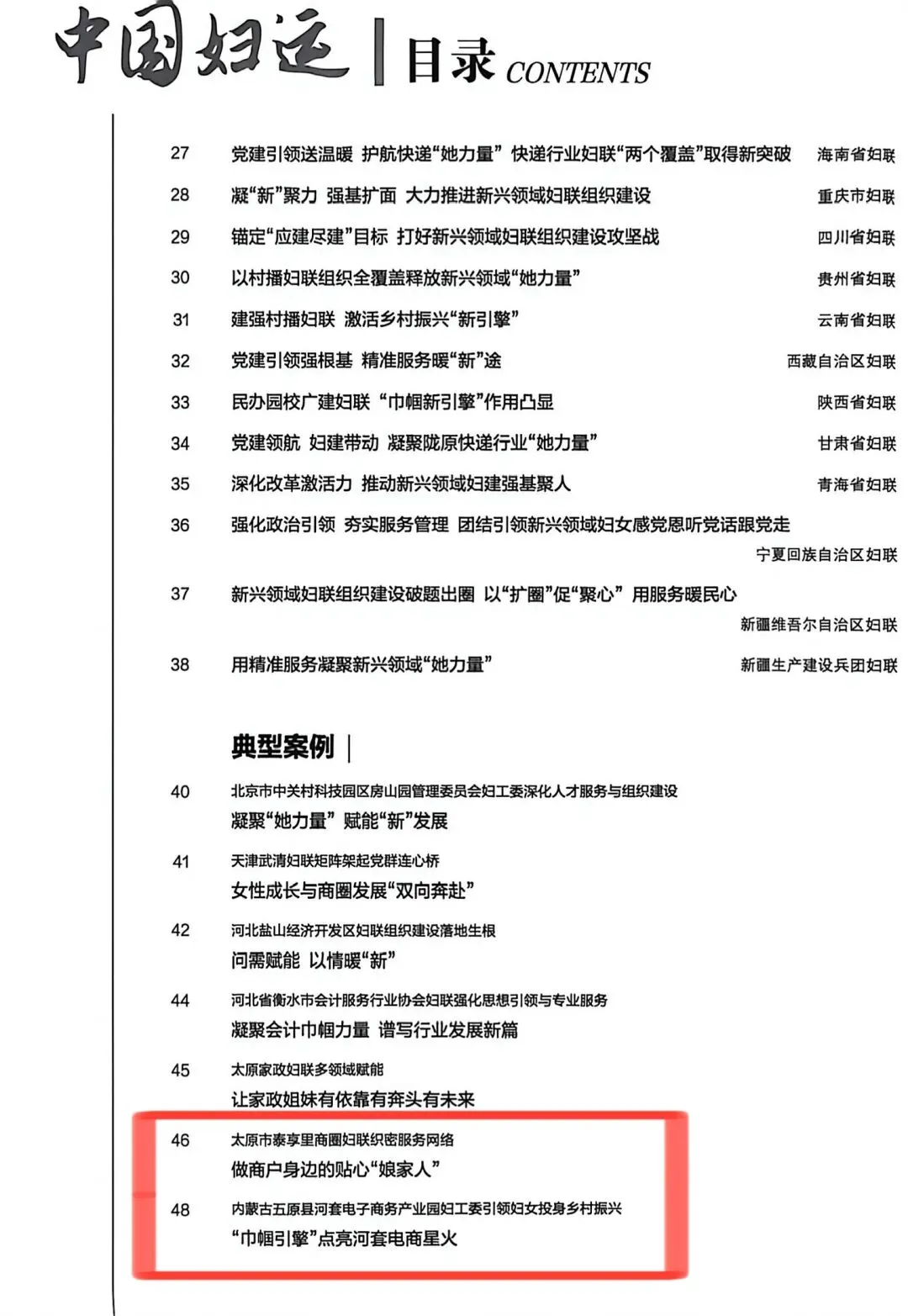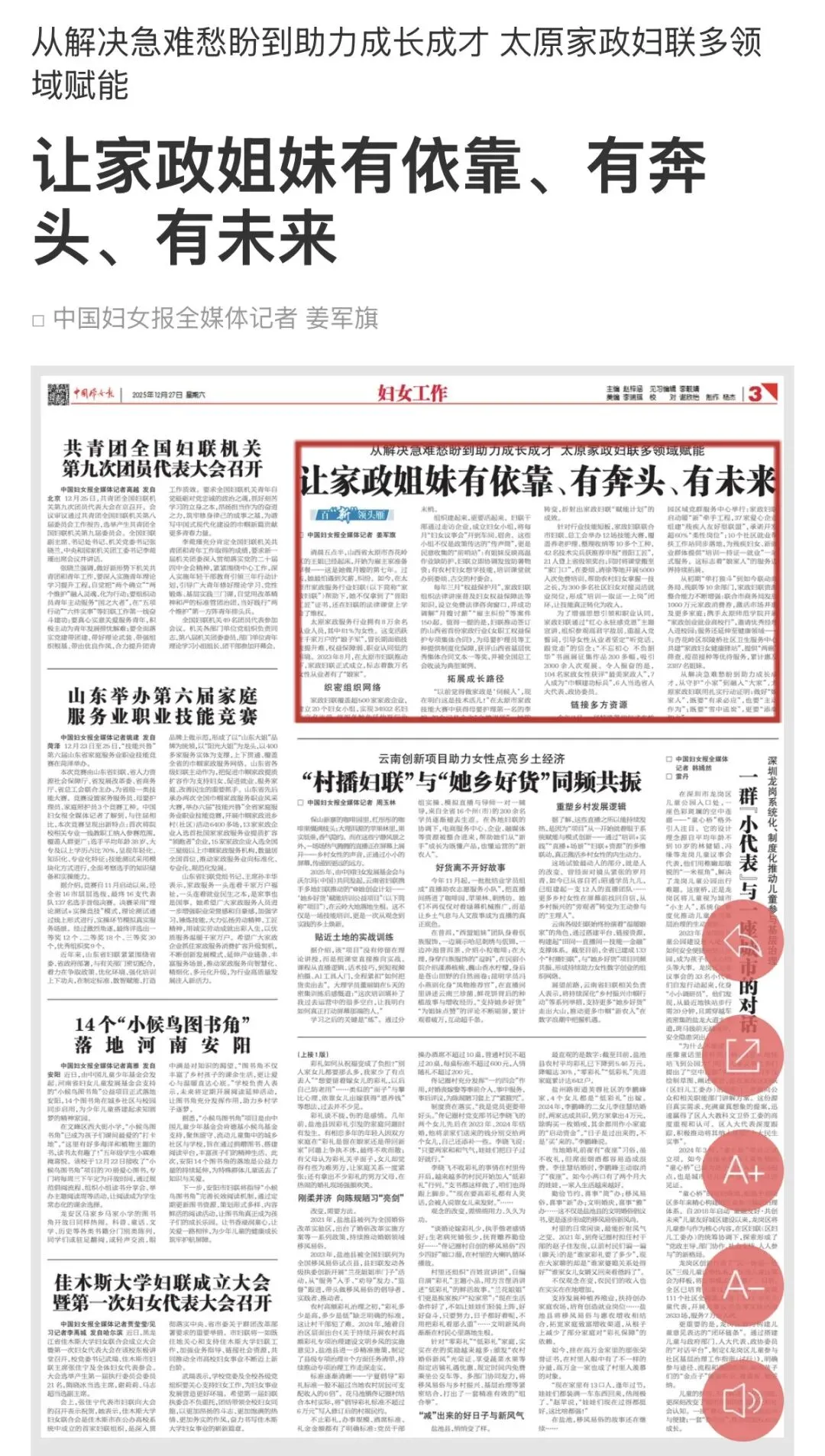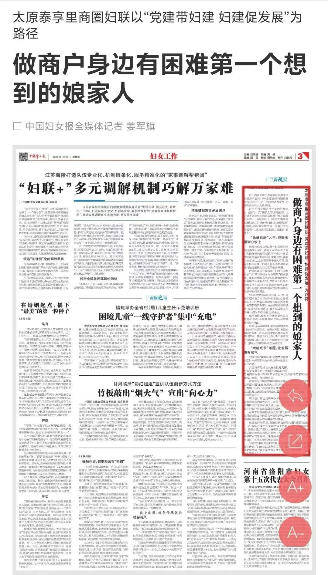 近日,《中国妇运》杂志2026年第2期“新兴领域妇联组织建设专刊”刊发了太原市家政行业妇联与太原市泰享里商圈妇联的案例。本期专刊中,我省仅有这两个案例入选。此前,《中国妇女报》于2025年12月26日、2026年1月23日分别对上述两家妇联组织进行了专题报道。