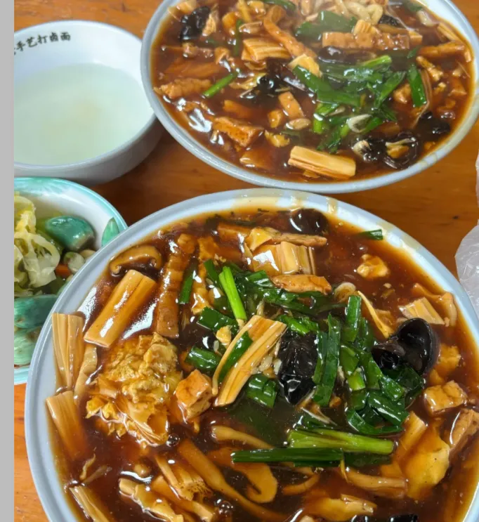 关键在那卤子上头。得用大骨头和老母鸡慢慢吊汤,然后放各种菌菇啊木耳啊黄花菜什么的,再加豆腐皮腐竹和炖肉。煮到软烂了,勾上芡,打进去鸡蛋花,最后撒把韭菜。