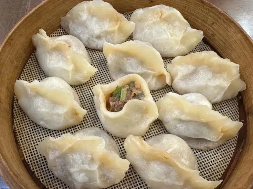 他家的蒸饺最出名。面皮擀得薄,馅料用新鲜牛羊肉调的,加了秘制调料。包好了上锅蒸。