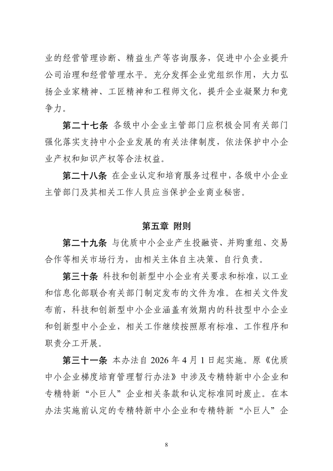 太原市工业和信息化局关于开展2026年专精特新“小巨人”企业推荐和复核工作的通知各县(市、区)、中北高新区中小企业主管部门: 根据山西省工业和信息化厅《关于开展2026年专精特新“小巨人”企业推荐和复核工作的通知》(晋工信企业字〔2026〕38号)的要求,我市将组织开展推荐工作,现将申报有关事项通知如下: 一、申报时间和方式 企业自2026年4月25日至5月20日通过优质中小企业梯度培育平台(https://zjtx.miit.gov.cn)进行网上申报与复核,并将相关申报材料上传。 二、有关要求 (一)各县(市、区)、中北高新区中小企业主管部门要积极宣传,组织辖区内相关企业申报、复核,申请企业应严格按照《优质中小企业梯度培育管理办法》(工信部企业〔2026〕2号,以下简称《办法》)中关于专精特新“小巨人企业的认定标准,相关指标按照《办法》附件4中“部分指标和认定标准”严格把握;各县(市、区)、中北高新区中小企业主管部门对照专精特新“小巨人”企业认定标准逐一审查、现场核实后,并填写现场核查表,一并将材料报送市工信局。对于未推荐复核的专精特新“小巨人”企业,要说明原因。 (二)各县(市、区)、中北高新区中小企业主管部门于 2026年5月20日前上报加盖公章的正式推荐文件(一式三份),包含推荐汇总表、复核情况汇总表,第八批专精特新“小巨人”企业申请书(申请书首页填写“企业名称”并加盖企业公章)、纸质件及可编辑版、PDF版,第八批申报专精特新“小巨人”企业、2023年认定的第五批和复核通过的第二批专精特新“小巨人”企业申报、复核申请书和佐证材料合订本各2份(佐证材料加封面和目录,在各项材料标题处加盖企业公章,并提供可编辑版、PDF版)报送市工信局。 (三)各县(市、区)、中北高新区中小企业主管部门以及申报、复核企业应严格按照省工信厅文件要求进行审核与准备。 联系人及联系电话:王建军 4223260 附件:1.山西省工业和信息化厅《关于开展2026年专精特新“小巨人”企业推荐和复核工作的通知》(晋工信企业字〔2026〕38号).pdf 2.《优质中小企业梯度培育管理办法》(工信部企业〔2026〕2号),专精特新“小巨人”企业认定标准及部分指标和相关要求.pdf 太原市工业和信息化局 2026年4月3 日 |