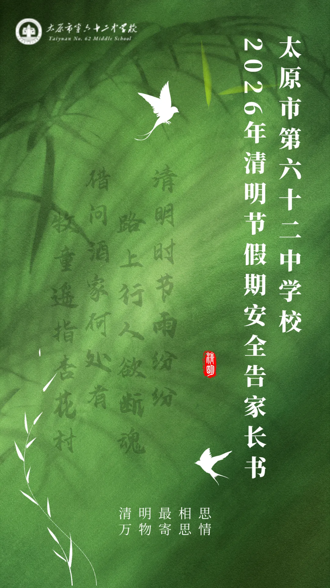 家长朋友们,文明祭扫是责任,传承文化是使命。让我们以实际行动,践行文明新风,守护绿色家园,引导孩子们铭记历史、缅怀先烈、感恩生活,让清明节成为一次有温度、有意义的文化之旅,共同为孩子们的健康成长保驾护航!