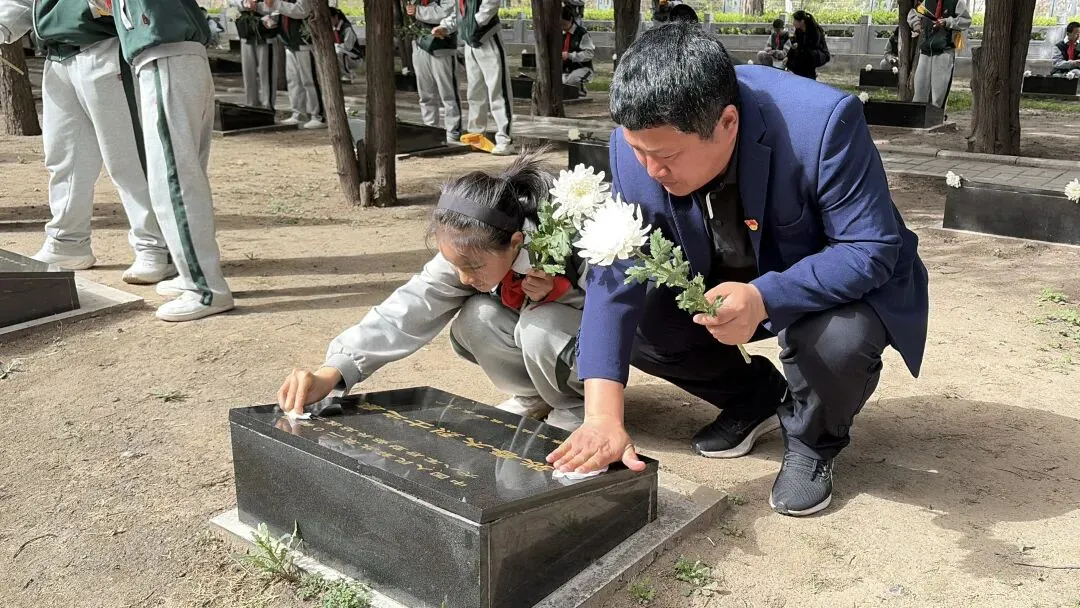 宣誓与寄语结束后,祭扫活动进入最后一个环节。同学们有序列队,缓步走到烈士墓前,小心翼翼地擦拭墓碑,为英烈献上朵朵鲜花,再深深鞠躬致意。一束束鲜花,承载着少年们对英烈的无限追思;一次次鞠躬,彰显着新时代少年的赤诚与敬意,用最质朴的方式表达对革命先辈的缅怀之情。