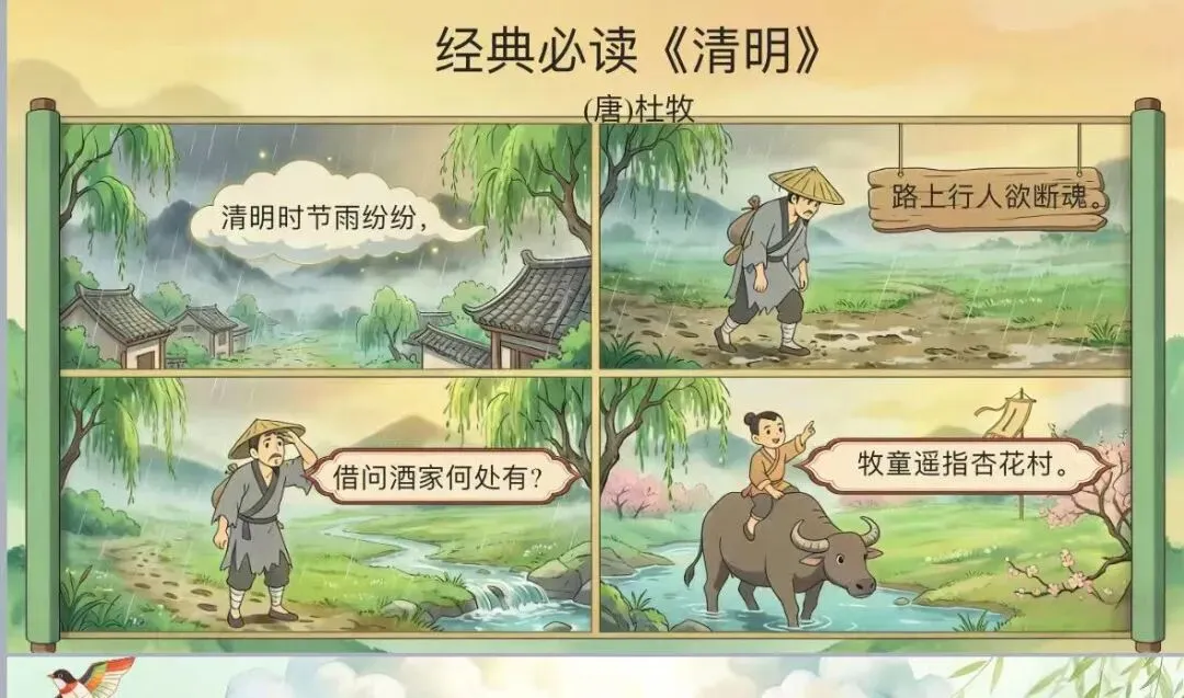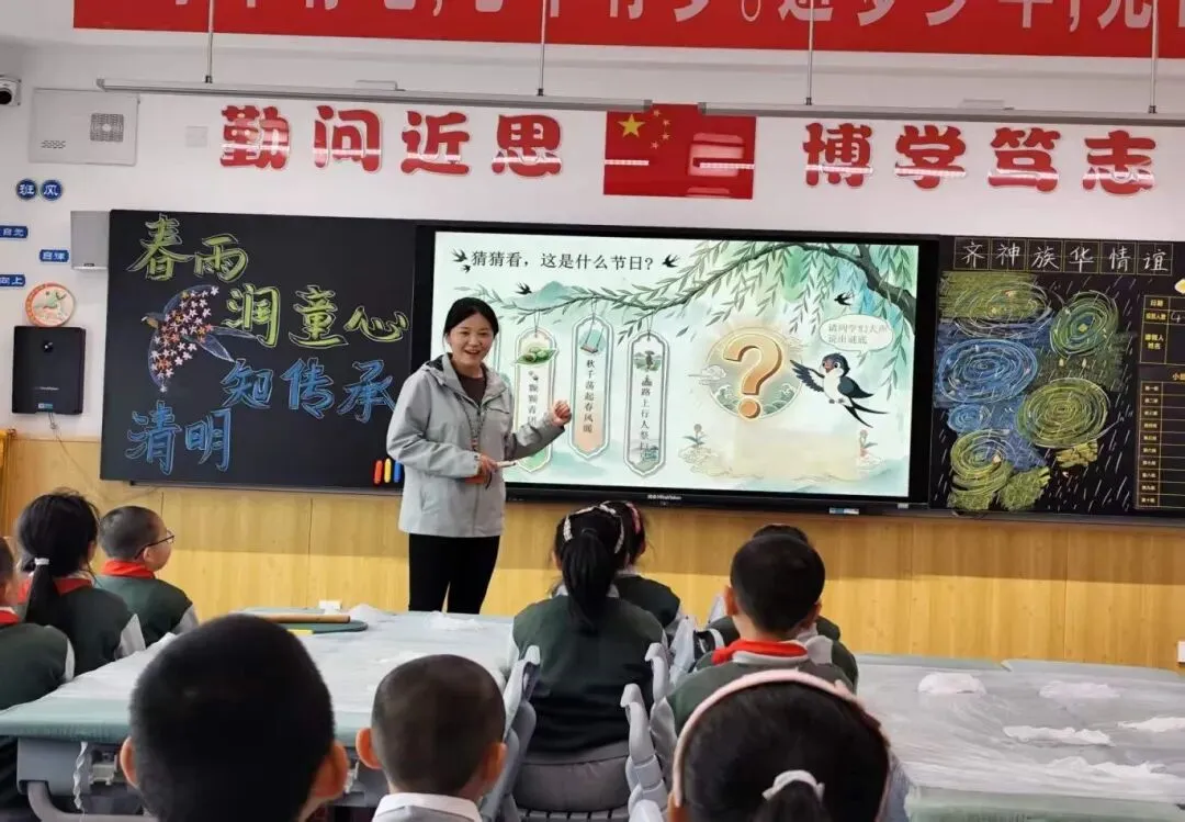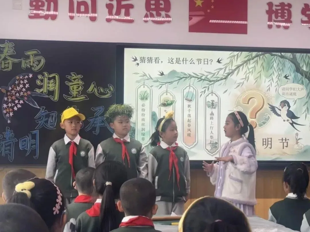 班会以趣味谜语开篇,“雨丝润草”“青团飘香”等充满春意的谜面,快速调动孩子们的热情,在竞猜中走近清明节。随后,老师结合千年传说与英雄事迹,生动解读清明节“慎终追远、迎春纳福”的双重内涵——从介子推的忠义故事,到袁隆平、黄继光等先辈的奉献壮举,让孩子们在聆听中读懂感恩、学会致敬,将爱国情怀悄然根植心底。
