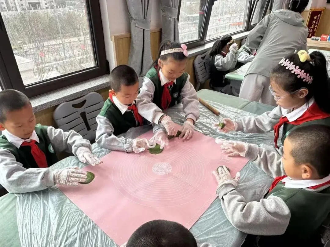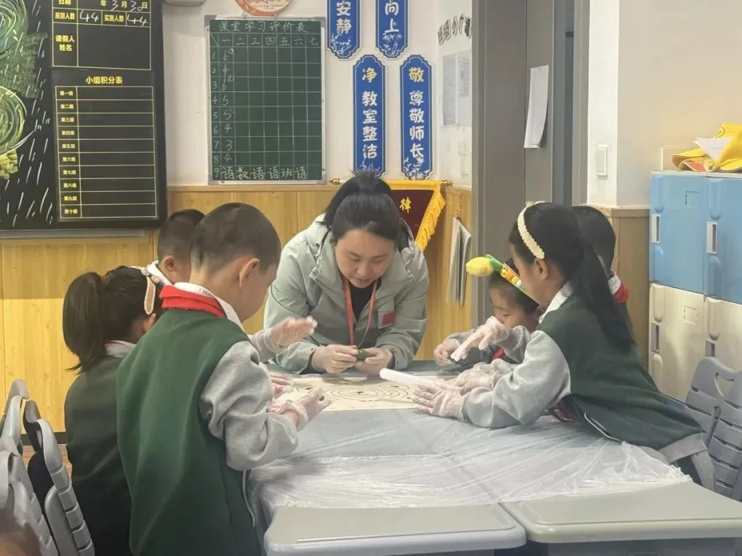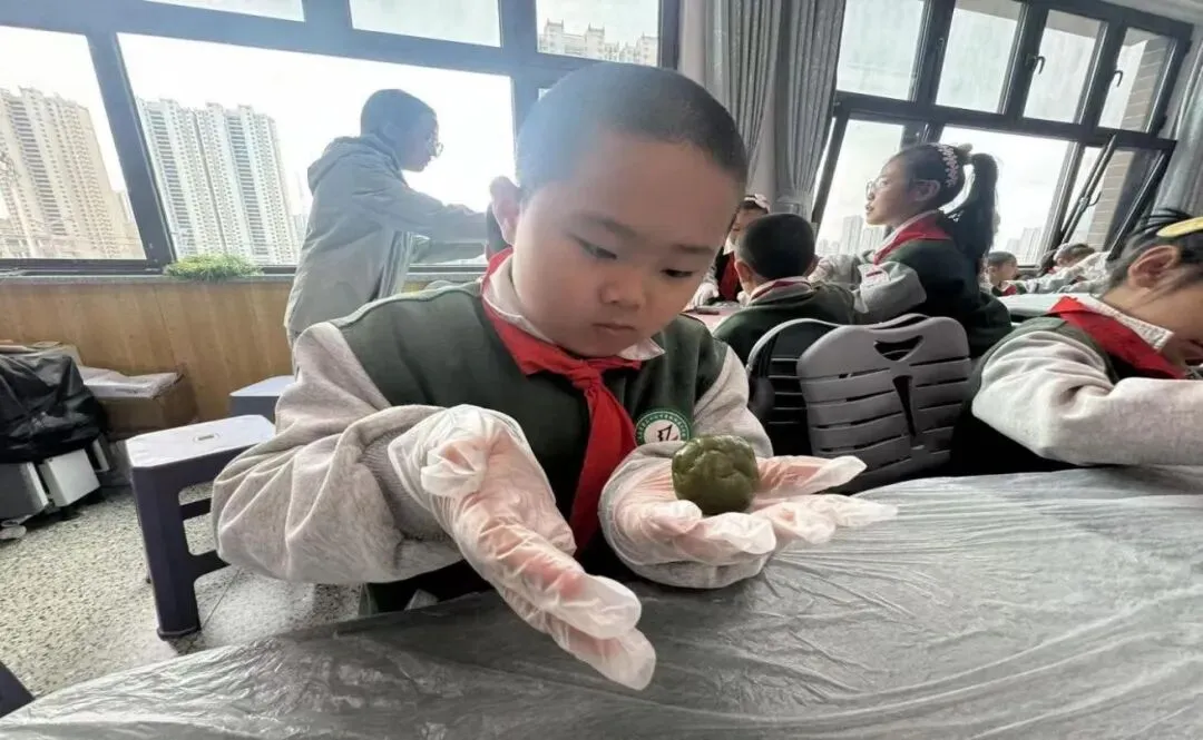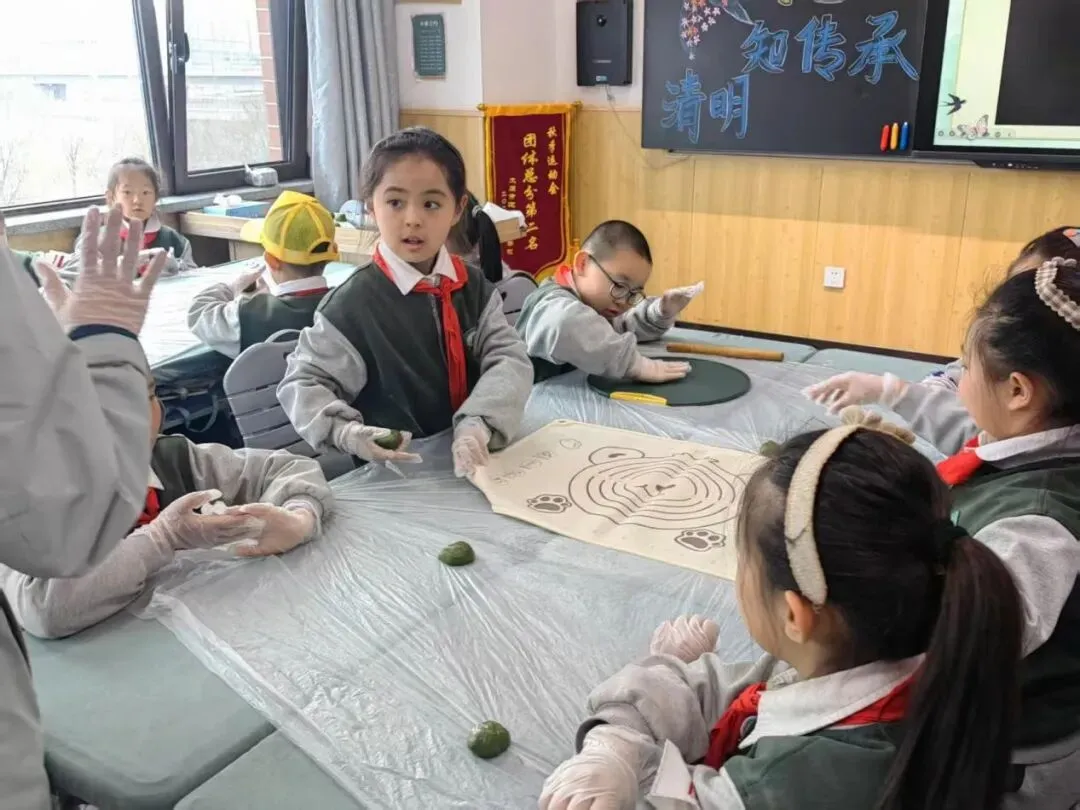 习俗探秘与动手实践环节亮点纷呈。老师带领孩子们了解清明踏青、植树、蹴鞠等民俗,分享南北特色美食,在交流中感受传统文化的魅力;手工体验环节,孩子们亲手制作青团,在揉、包、捏的过程中,将春日气息与民俗记忆融入指尖,在劳动中体会传统美食的文化底蕴。碧绿的艾草面皮包裹着香甜的内馅,一个个圆润可爱的青团在孩子们手中诞生,大家捧着自己的劳动成果,脸上洋溢着自豪与喜悦,真正把“春天”吃进了肚子里。此外,孩子们齐声诵读《清明》,分享周末制作的清明小报,他们在朗朗书声中品味古典诗词的韵律之美,在绘制的小报中,感悟清明的意境。