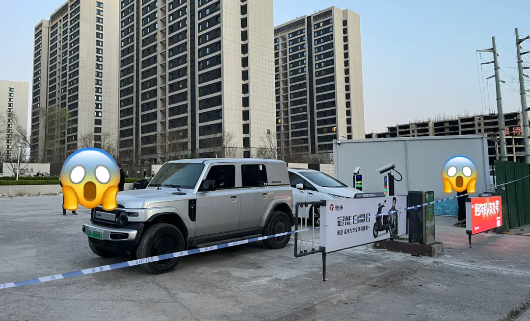 这次,在车挪的差不多的时候,入口处拉起来警戒线,并在原来的西侧入口和南侧安上了停车道闸。