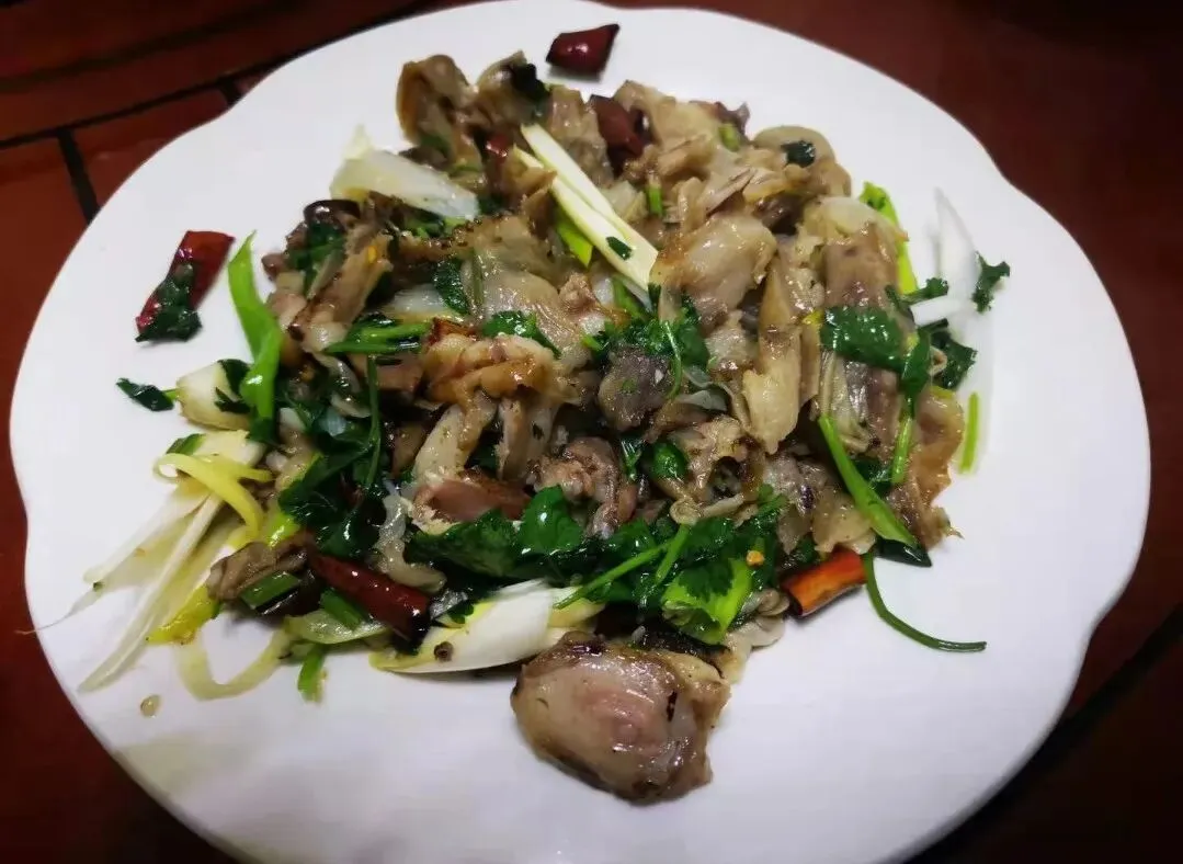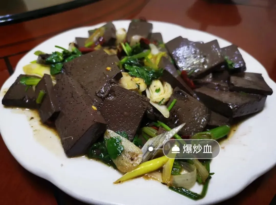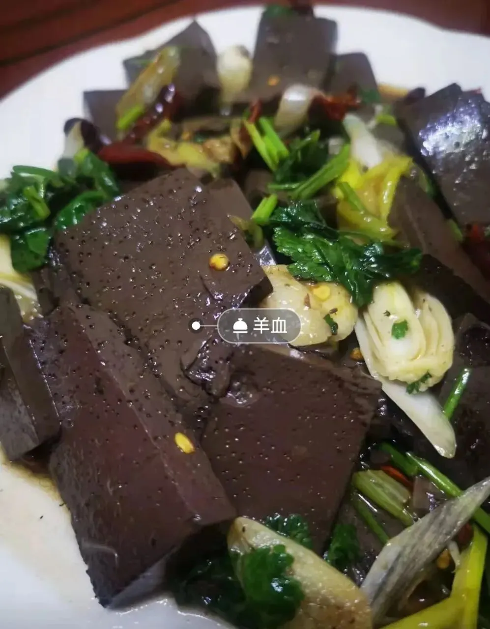羊血和羊脸的炒法一样,区别在于一个是荤的,另一个是素的。老板急火快炒,由于配头下的狠,所以炒出来很好吃。