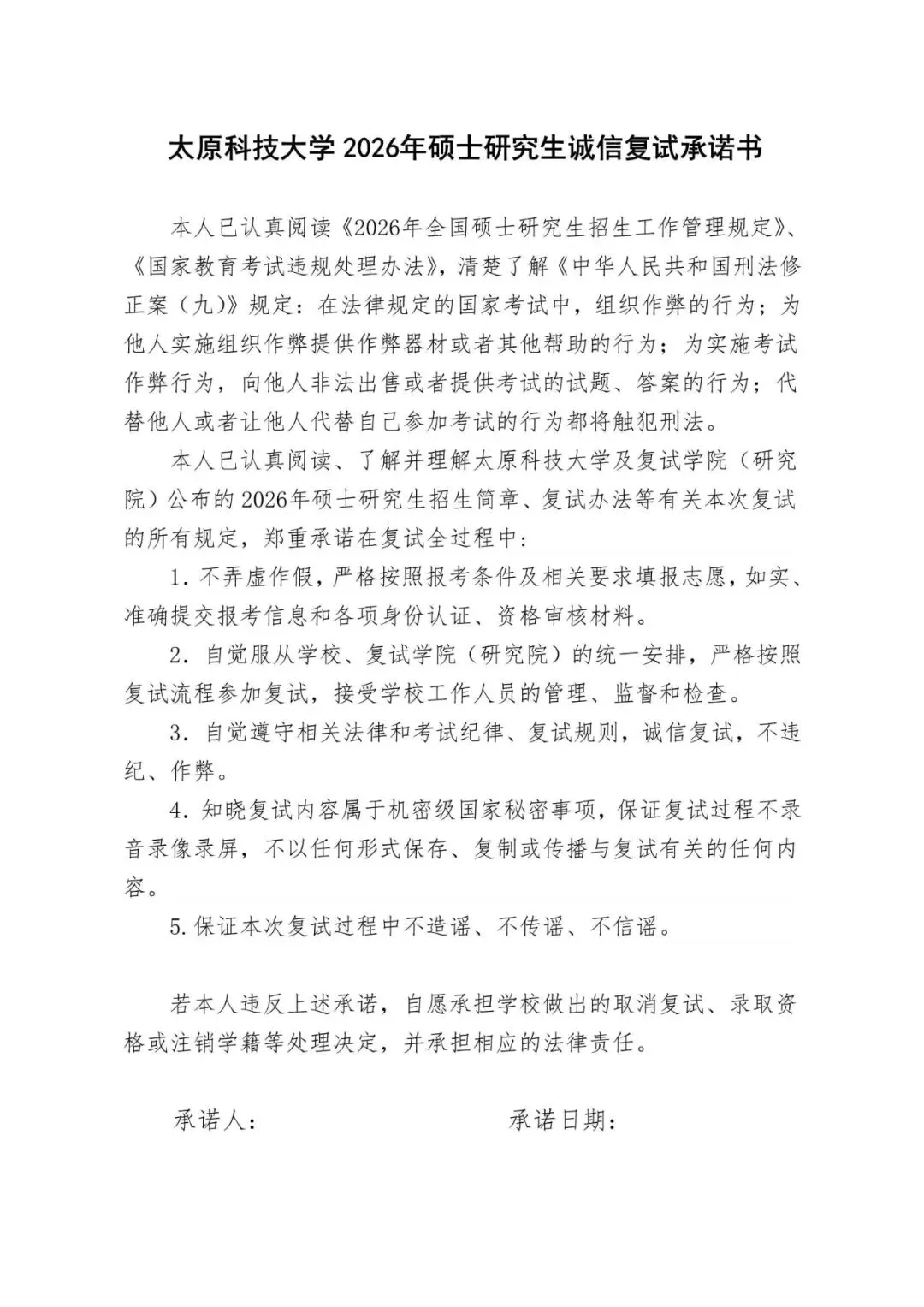 2.《太原科技大学2026年硕士研究生诚信复试承诺书》(附件2,须打印后认真阅读并签字确认);
