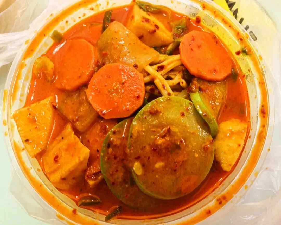 食材自选,蔬菜洗得干干净净,最惊艳的是他家麻酱,质地特别浓稠。老板挖一大勺,用少许热水化开,再配上辣椒等香料,把煮好的食材用力一拌,香到上头。