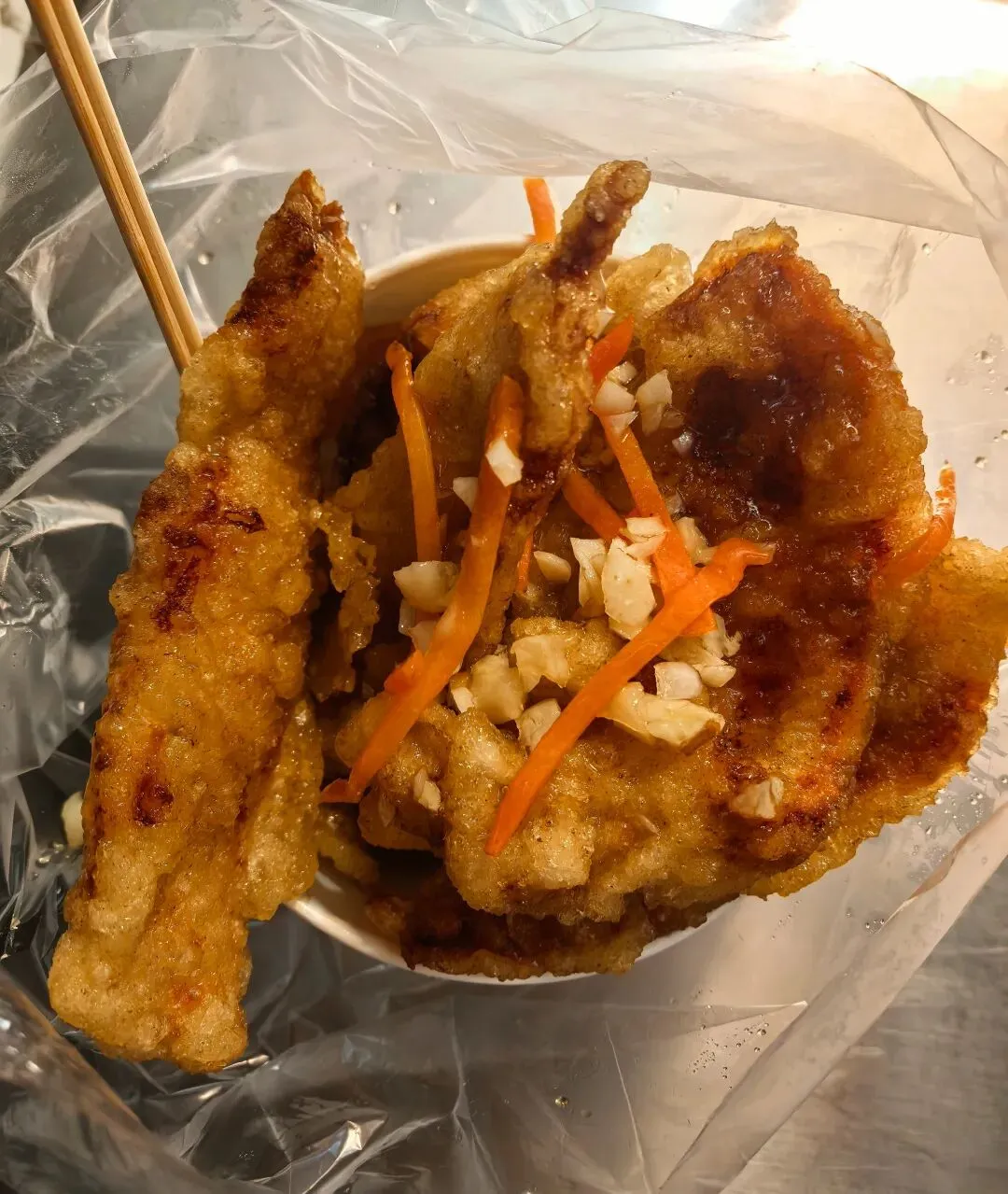 经典酸甜口,摊位上两个锅,一个炸肉,一个现调料汁,肉质新鲜,出锅撒上蒜末,趁热吃真的香!