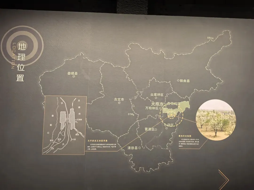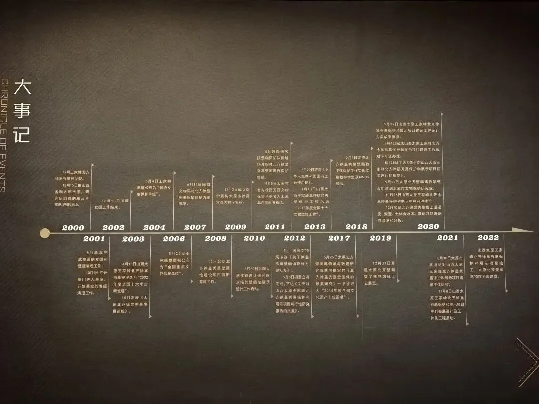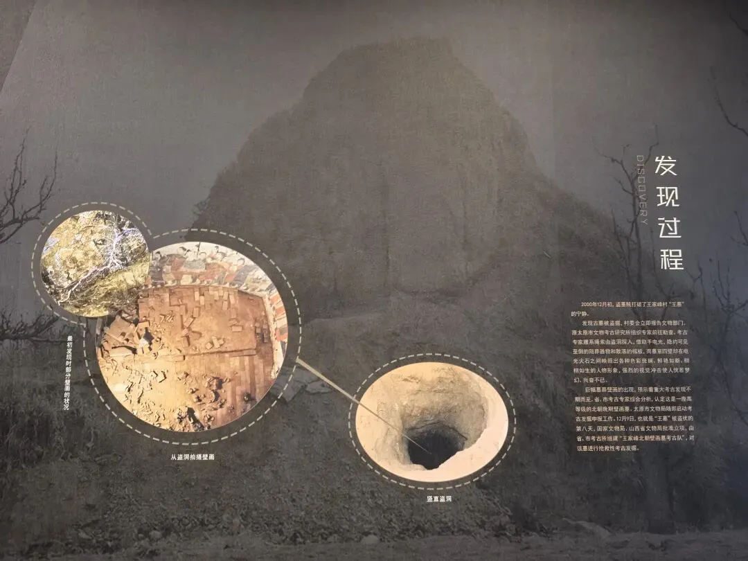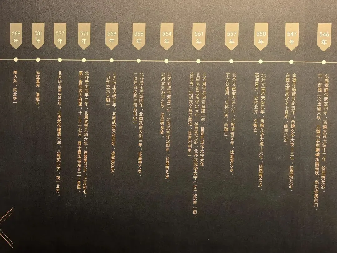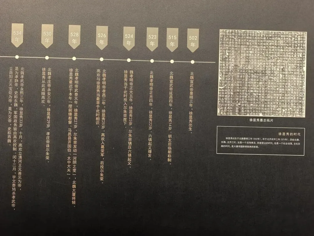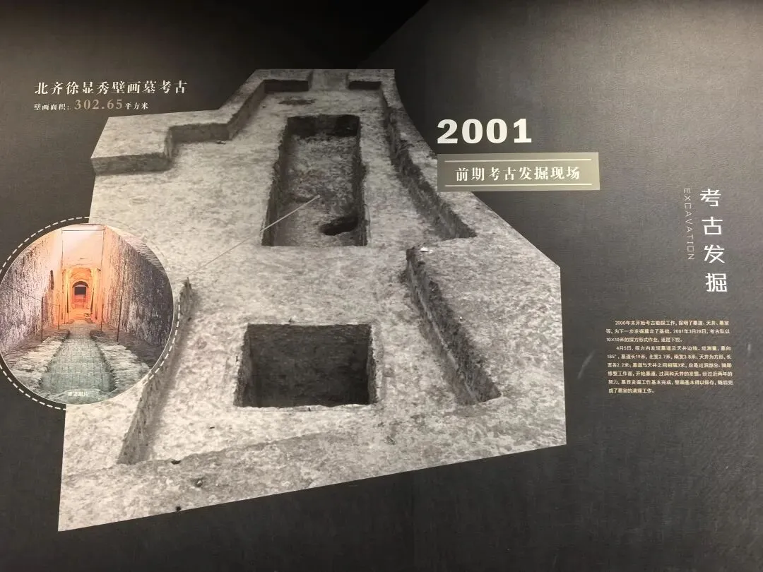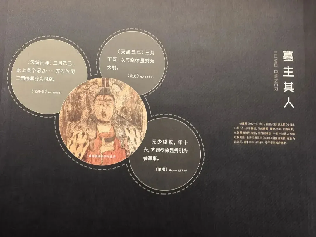 徐显秀墓历经五次盗掘,所幸壁画保存完整。从墓道、天井、甬道直至墓室,满壁施画,画家采用铁线勾勒和晕染技法,描绘人物、马匹、乐器等,仿若实物,线条疏密有致、色彩浓淡富有层次。穹窿顶的墓室空间,分层描绘了天空、仙界和人世间的华美图景,徐显秀夫妇身着华服,举杯宴饮,铅灰色的星空,飘舞的粉莲花,激昂的胡乐,娇羞的少女,威武的仪仗,场面宏大、气氛热烈,北齐晋阳的社会生活,如在眼前。充满异域文化元素的画面,诉说着丝路沿线各民族交流的盛况,阐释着中华民族多元一体的演进历程。徐显秀墓经历了近十五个世纪的漫长等待,终于迎着2000年新世纪的曙光,横空出世,它精美的巨幅画卷震惊世界,并且荣登"2002年全国十大考古发现"之列。这个熠熠生辉的北齐绘画实物作品,是历史给予我们的馈赠,也是中华民族和丝路各民族的珍贵文化遗产,更是建设"一带一路"盛世的宝贵精神财富。让我们一同走进这个美轮美奂,令人无比向往的北齐给画世界,走近北齐武安王徐显秀。该墓出土各类器物500余件,尤为难能可贵的是从墓道到墓室分布着保存完好、色彩艳丽、内容丰富的壁画。壁画总面积约300余平方米,以简练的线条准确描绘了各类人物,以及马匹、牛车、神兽、仪仗、兵器、乐器、生活什物和装饰图案。徐显秀墓壁画是目前已发现北朝保存最完整的大型墓葬壁画,为研究当时的丧葬制度、社会生活、民族融合、壁画艺术等提供了重要资料。徐显秀墓壁画,是继娄叡墓壁画后又一重大发现,是南北朝美术考古史上的一大盛事,可谓惊世骇俗,意义深远。北齐武安王徐显秀墓发现于太原市迎泽区王家峰村。这里位于太原东山,海拔约900米,气候干旱少雨,土质坚硬。在王家峰村东1公里处有一片100多亩的梨园,每当春天到来,梨花盛开,馨香四溢,徐显秀墓就坐落于这片梨园内。2000年12月初,盗墓贼打破了王家峰村"王墓"的宁静。发现古墓被盗掘,村委会立即报告文物部门。原太原市文物考古研究所组织专家前往勘查。考古专家腰系绳索由盗洞探入,借助手电光,隐约可见歪倒的陪葬器物和散落的棺板,而墓室四壁却在电光火石之间映照出各种色彩斑斓、鲜艳如新、栩栩如生的人物形象,强烈的视觉冲击使人恍若梦幻、兴奋不已。巨幅墓葬壁画的出现,预示着重大考古发现不期而至。省、市考古专家综合分析,认定这是一座高等级的北朝晚期壁画墓。太原市文物局随即启动考古发掘申报工作。12月9日,也就是"王墓"被盗扰的第八天,国家文物局、山西省文物局批准立项,由省、市考古所组建"王家峰北朝壁画墓考古队",对该墓进行抢救性考古发掘。2000年末开始考古勘探工作,探明了墓道、天井、墓室等,为下一步发掘奠定了基础。2001年3月28日,考古队以10x10米的探方形式作业,逐层下挖。4月5日,探方内发现墓道及天井边线。经测量,墓向185º,墓道长19米,北宽2.7米,南宽3.8米;天井为方形,长宽各2.2米;墓道与天井之间相隔3米,应是过洞部分。随即修整工作面,开始墓道、过洞和天井的发掘。经过近两年的努力,墓葬发掘工作基本完成,壁画基本得以保存,随后完成了墓室的清理工作。徐显秀(502-571年),名颖,恒州忠义郡(今河北北部)人,少年豪侠,作战勇猛,屡立战功。北魏未期,他先是追随尔朱荣,后归顺高欢,一步一步进入东魏政权高层。北齐河清三年(664年)因作战英勇,被封为武安王。武平二年(571年),卒于晋阳城府第中。★(天统四年)三月乙巳,太上皇帝诏以……开府仪同三司徐显秀为司空。徐显秀出生于北魏景明三年(502年),卒于北齐武平二年(571年),历经北魏、东魏、北齐三代。这是一个沧海横流、英雄辈出的时代,也是一个社会动荡,文化交融的时代,是大唐帝国即将到来的前夜。★515年 北魏宣武帝延昌四年,徐显秀14岁。胡太后临朝称制。★523年 北魏孝明帝正光四年,徐显秀22岁。六镇起义爆发。★524年 魏孝明帝正光五年,徐显秀23岁。尔朱荣镇压六镇起义。徐显秀当于此时投入尔朱荣麾下。★526年 北魏孝明帝孝昌二年,徐显秀25岁。高欢入葛荣军,后投尔朱荣。高欢与徐显秀当最早于此时相识。★528年 北魏孝明帝武泰元年,徐显秀27岁。尔朱荣发动『河阴之变』,北魏大厦将倾。徐显秀最迟于本年『授前锋都督、马邑县开国伯、太中大夫』。★530年 北魏孝庄帝永安三年,徐显秀29岁。孝庄帝诛尔朱荣。徐显秀从此追随高欢。★534年 北魏孝武帝永熙三年,徐显秀33岁。十月,高欢立清河王元善见为帝,是为孝静帝,史称东魏,军国政务皆由高欢控制。闰十二月,宇文泰鸠(鸩)杀孝武帝,立南阳王元宝炬为帝,是为文帝,史称西魏。546年 东魏孝静帝武定四年,西魏文帝大统十二年,徐显秀45岁。东、西魏二次玉壁大战,西魏韦孝宽屡破东魏高欢,高欢染病东归。★547年 东魏孝静帝武定五年,西魏文帝大统十三年,徐显秀46岁。东魏丞相高欢卒于晋阳,终年52岁。★550年 北齐文宣帝天保元年,西魏文帝大统十六年,徐显秀49岁。高洋建齐,史称北齐,东魏亡。★557年 北齐文宣帝天保八年,北周明帝元年,徐显秀56岁。宇文觉建周,史称北周,西魏亡。★561年 北齐肃宗孝昭帝皇建二年、世祖武成帝太宁元年,北周高祖武帝保定元年,徐显秀60岁。北齐武成帝太宁(561-562年)初,徐显秀『别封武乡县开国伯,除宜州刺史』。★564年 北齐武成帝河清三年,北周武帝保定四年,徐显秀63岁。北周北齐洛阳之