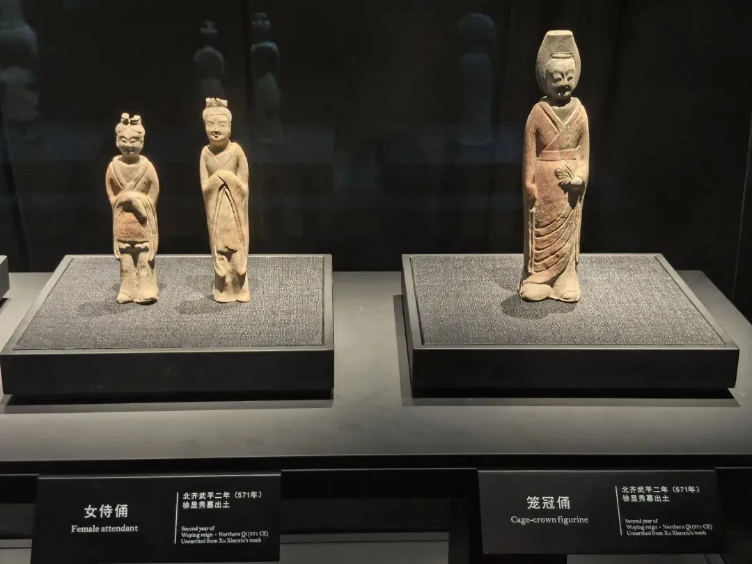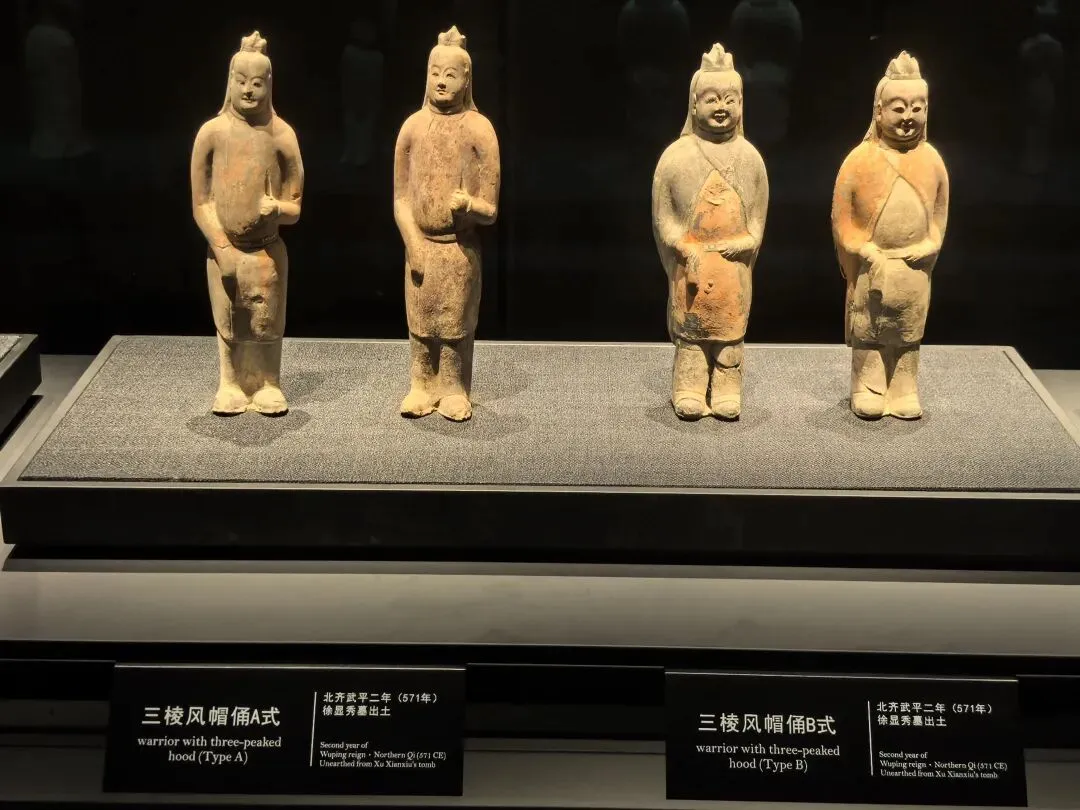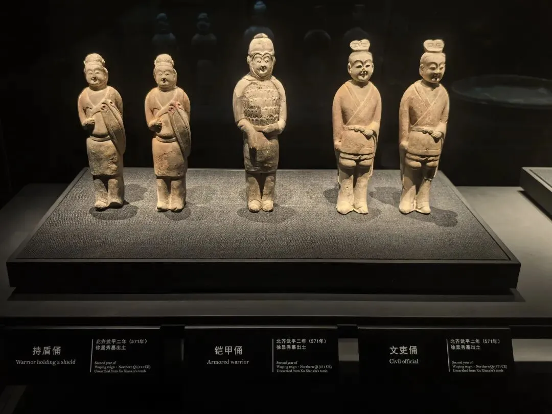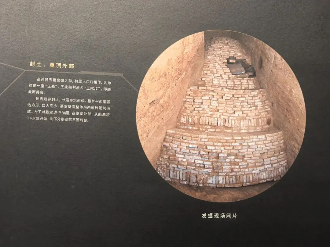 墓道、过洞、天井、墓门、甬道、墓室、陪葬器物、陪葬器物、棺床在徐显秀墓发掘之前,村里人口口相传,认为这是一座"王墓"。王家峰村原名"王家坟",即由此而得名。地表残存封土,分层夯筑而成。墓圹平面呈弧边方形,口大底小。墓室壁面整体为两层砖砌筑而成。为了对墓室进行加固,在墓室外部,从距墓顶0.6米处开始,向下分别砌筑三圈砖台。★对于理解晋阳城在北齐政治格局和中古时期北方多元文化交融中的特殊地位有重要意义。★墓葬结构和独特的壁画构图方式,对于研究中国古代墓葬制度史和北齐壁画墓有重要的学术价值。★壁画中大量带有中亚、西域特色的图像元素,配合文献相关记载,是研究北齐社会"胡化"的第一手资料。★是继北齐东安王娄睿墓壁画之后,了解北齐"简易标美"新画风的珍贵图像资料。★壁画中丰富的粟特美术图像,对于粟特学研究和中西文化交流研究具有重要学术价值。★完整的大型场景墓室壁画,包括起稿、用色、晕染和线图等多种技法的展现,是研究北朝墓葬绘画技法的第一手资料。★壁画所反映的独特而多元的宗教因素,为研究北齐时期的宗教信仰提供了重要素材。西壁绘墓主人准备出行的场画。青罗伞盖下一匹枣红骏马整装待发,马颈下挂着装饰忍冬、联珠纹的缨子,马背上鞍袱边缘绘有联珠纹,联珠纹内绘制类似菩萨的人头像,骏马前面是四个三旒旗手佩剑武士和马夫;后面是羽葆执事、捧官印、扛胡床的随从人员。马后随从中一人头裏紫色折上巾,身着紫色窄袖右衽长袍,腰系红带,脚蹬黑色靿靴,双手隐于袖中,左肩扛一胡床。其身后一人为壁画所绘人物中最矮者,身高1.42米,同样头裏紫色折上巾,身着浅黄色窄袖右衽长袍,腰系黑带,脚蹬紫色靿靴,双手隐于袖中,腋下夹一方形物,可能为茵褥。女主人右侧贴身女侍头梳双髻,身穿红色长裙,裙上饰圈状联珠纹,联珠纹内绘对兽,外披窄袖衫,脚蹬紫色皮靴,手捧漆杯,恭恭敬敬。身后为4名女伎,分別演奏响板、竖箜篌、笙和琵琶。女伎身后又有数名女侍,均梳飞鸟髻。宴饮图