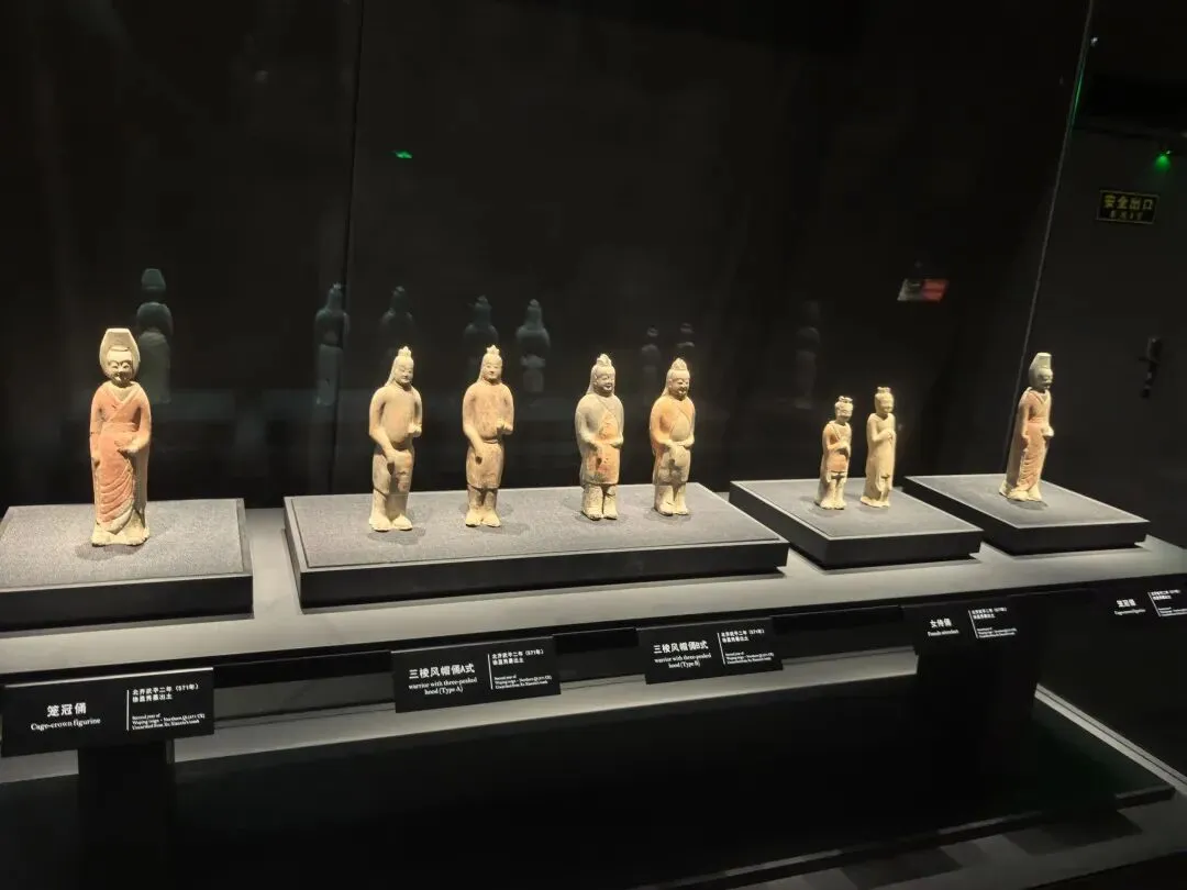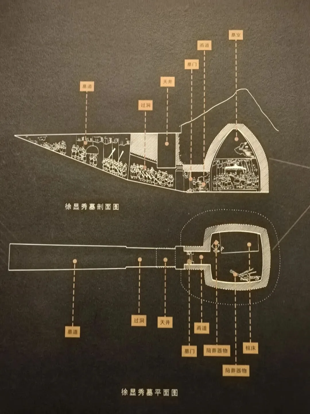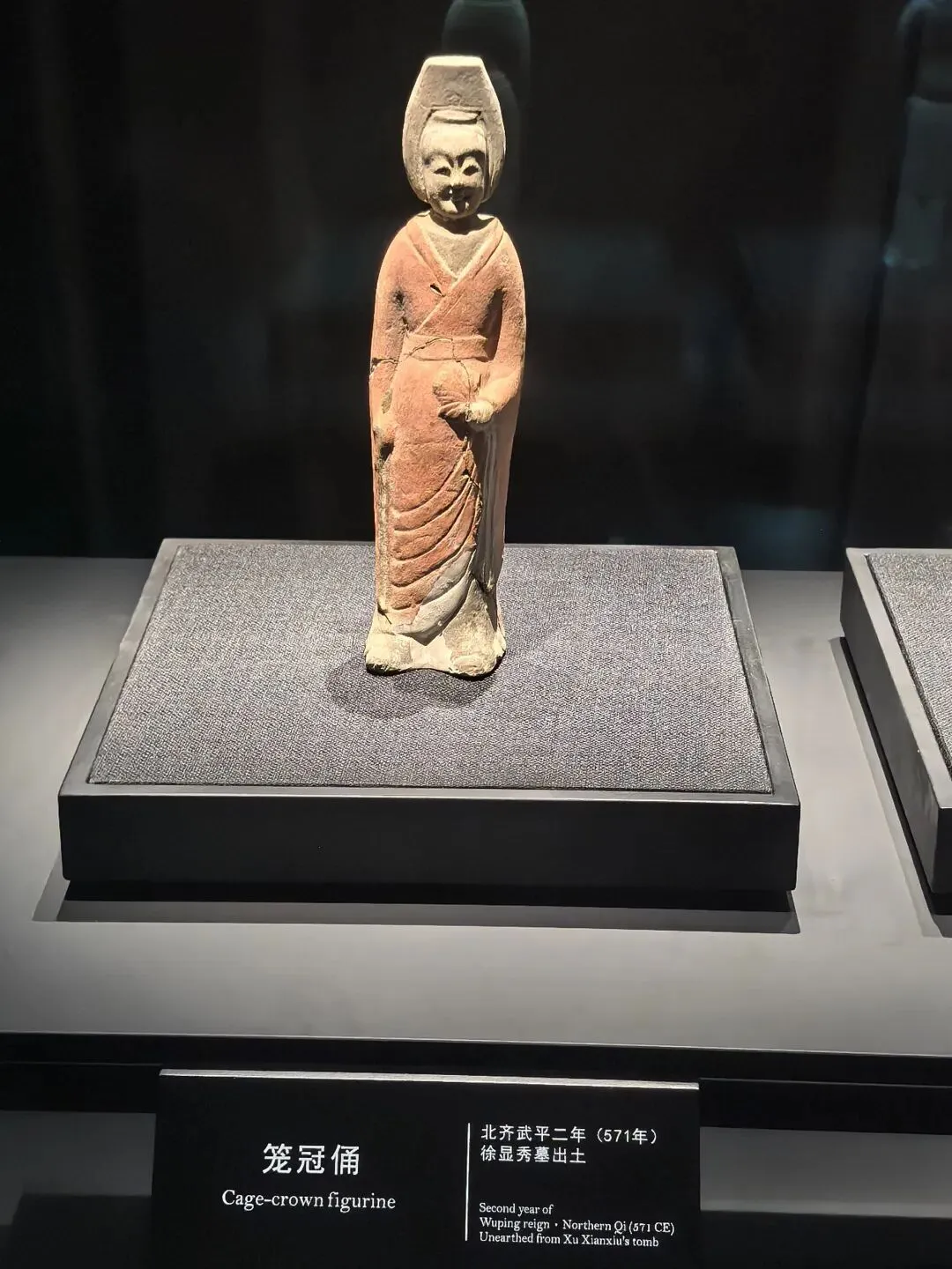 墓道、过洞、天井、墓门、甬道、墓室、陪葬器物、陪葬器物、棺床在徐显秀墓发掘之前,村里人口口相传,认为这是一座"王墓"。王家峰村原名"王家坟",即由此而得名。地表残存封土,分层夯筑而成。墓圹平面呈弧边方形,口大底小。墓室壁面整体为两层砖砌筑而成。为了对墓室进行加固,在墓室外部,从距墓顶0.6米处开始,向下分别砌筑三圈砖台。★对于理解晋阳城在北齐政治格局和中古时期北方多元文化交融中的特殊地位有重要意义。★墓葬结构和独特的壁画构图方式,对于研究中国古代墓葬制度史和北齐壁画墓有重要的学术价值。★壁画中大量带有中亚、西域特色的图像元素,配合文献相关记载,是研究北齐社会"胡化"的第一手资料。★是继北齐东安王娄睿墓壁画之后,了解北齐"简易标美"新画风的珍贵图像资料。★壁画中丰富的粟特美术图像,对于粟特学研究和中西文化交流研究具有重要学术价值。★完整的大型场景墓室壁画,包括起稿、用色、晕染和线图等多种技法的展现,是研究北朝墓葬绘画技法的第一手资料。★壁画所反映的独特而多元的宗教因素,为研究北齐时期的宗教信仰提供了重要素材。西壁绘墓主人准备出行的场画。青罗伞盖下一匹枣红骏马整装待发,马颈下挂着装饰忍冬、联珠纹的缨子,马背上鞍袱边缘绘有联珠纹,联珠纹内绘制类似菩萨的人头像,骏马前面是四个三旒旗手佩剑武士和马夫;后面是羽葆执事、捧官印、扛胡床的随从人员。马后随从中一人头裏紫色折上巾,身着紫色窄袖右衽长袍,腰系红带,脚蹬黑色靿靴,双手隐于袖中,左肩扛一胡床。其身后一人为壁画所绘人物中最矮者,身高1.42米,同样头裏紫色折上巾,身着浅黄色窄袖右衽长袍,腰系黑带,脚蹬紫色靿靴,双手隐于袖中,腋下夹一方形物,可能为茵褥。女主人右侧贴身女侍头梳双髻,身穿红色长裙,裙上饰圈状联珠纹,联珠纹内绘对兽,外披窄袖衫,脚蹬紫色皮靴,手捧漆杯,恭恭敬敬。身后为4名女伎,分別演奏响板、竖箜篌、笙和琵琶。女伎身后又有数名女侍,均梳飞鸟髻。宴饮图