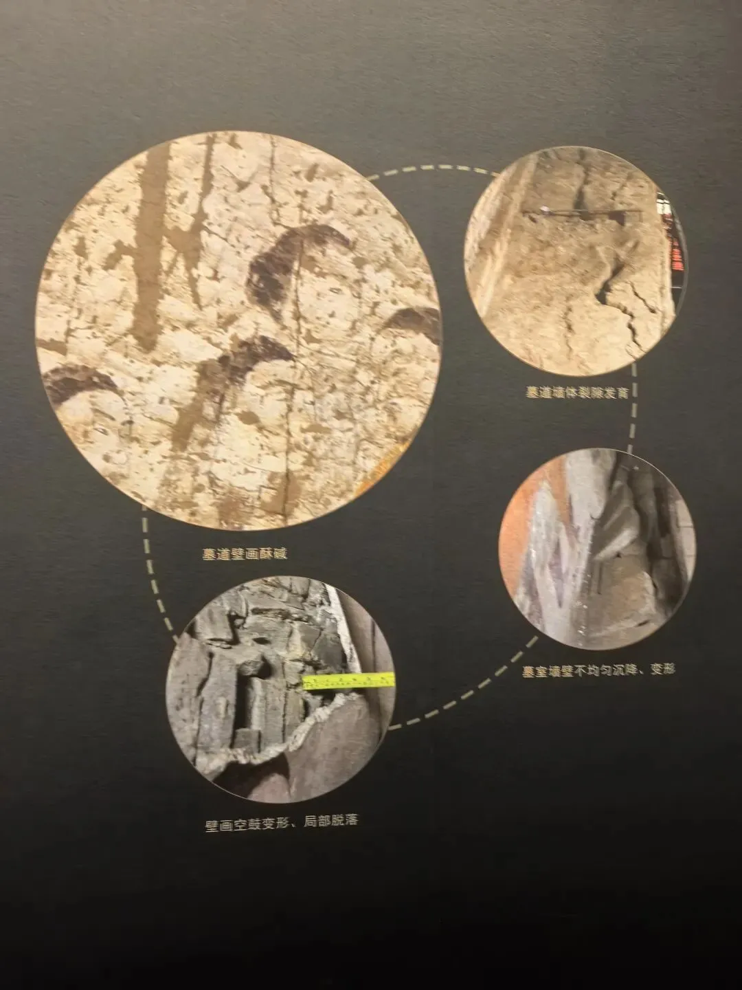 墓葬赋存环境条件方面,主要表现为降雨、灌溉、土壤水分入渗、墓室湿度大等。从壁画支撑体方面看,主要反映在墓室墙壁不均匀沉降、变形,墓道两侧裂隙发育等。壁画本体主要有不同程度的空鼓、酥碱、起甲、污染甚至局部脱落等病害。墓道墙体裂隙发育