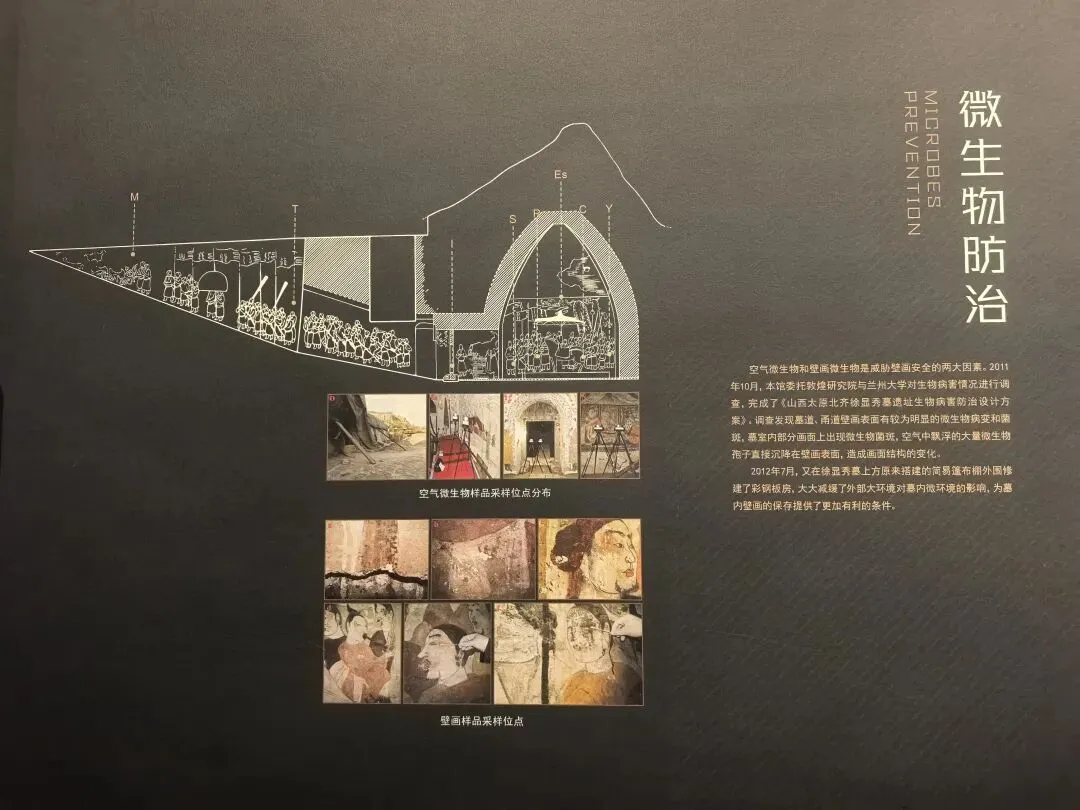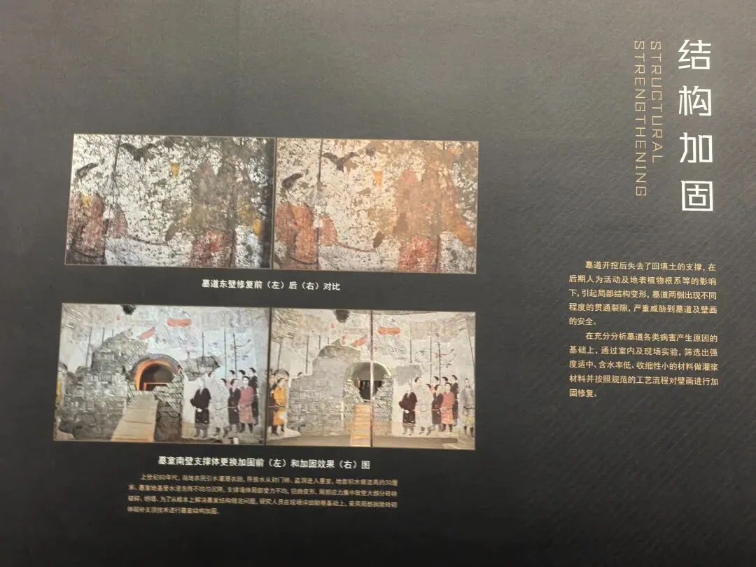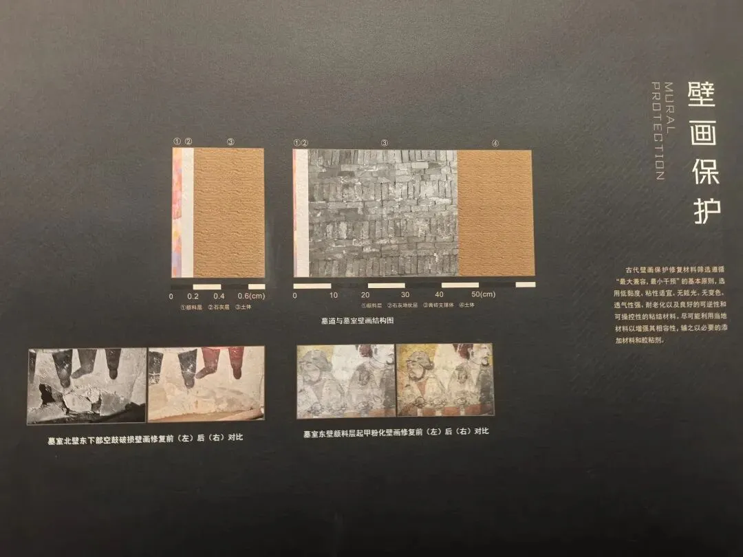 壁画空鼓变形、局部脱落墓道开挖后失去了回填土的支撑,在后期人为活动及地表植物根系等的影响下,引起局部结构变形,墓道两侧出现不同程度的贯通裂隙,严重威胁到墓道及壁画的安全。在充分分析墓道各类病害产生原因的基础上,通过室内及现场实验,筛选出强度适中、含水率低、收缩性小的材料做灌浆材料并按照规范的工艺流程对壁画进行加固修复。★墓室南壁支撑体更换加固前(左)和加固效果(右)图上世纪80年代,当地农民引水灌溉农田,导致水从封门砖、盗洞进入墓室,地面积水痕迹高约30厘米。墓室地基受水浸泡而不均匀沉降,支撑墙体局部受力不均,扭曲变形,局部应力集中致使大部分砖块破碎、坍塌。为了从根本上解决墓室结构稳定问题,研究人员在现场详细勘察基础上,采用局部拆除砖砌体砌补支顶技术进行墓室结构加固。空气微生物和壁画微生物是威胁壁画安全的两大因素。2011年10月,本馆委托敦煌研究院与兰州大学对生物病害情况进行调查,完成了《山西太原北齐徐显秀墓遗址生物病害防治设计方案》。调查发现墓道、甬道壁画表面有较为明显的微生物病变和菌斑,墓室内部分画面上出现微生物菌斑,空气中飘浮的大量微生物孢子直接沉降在壁画表面,造成画面结构的变化。2012年7月,又在徐显秀墓上方原来搭建的简易蓬布棚外围修建了彩钢板房,大大减缓了外部大环境对墓内微环境的影响,为墓内壁画的保存提供了更加有利的条件。古代壁画保护修复材料筛选遵循"最大兼容,最小干预"的基本原则,选用低黏度、粘性适宜、无眩光、无变色、透气性强、耐老化以及良好的可逆性和可操控性的粘结材料,尽可能利用当地材料以增强其相容性,辅之以必要的添加材料和胶粘剂。★墓室东壁颜料层起甲粉化壁画修复前(左)后(右)对比★墓室北壁东下部空鼓破损壁画修复前(左)后(右)对比听专家访谈
