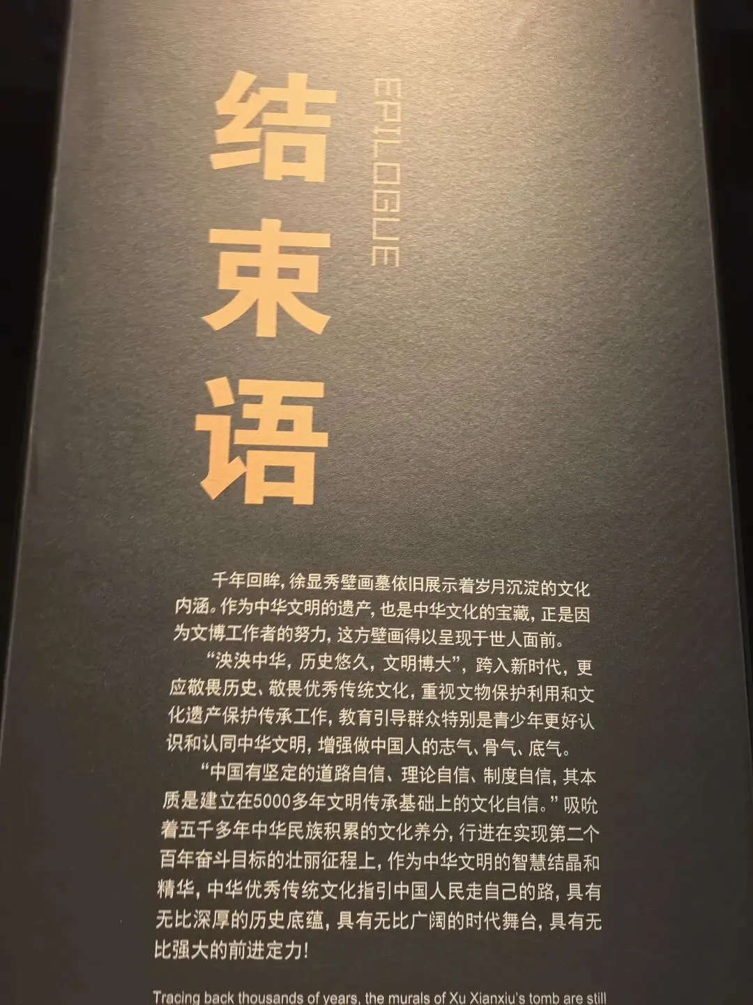 ★王江馆长带你去看馆千年回眸,徐显秀壁画墓依旧展示着岁月沉淀的文化内涵。作为中华文明的遗产,也是中华文化的宝藏,正是因为文博工作者的努力,这方壁画得以呈现于世人面前。"泱泱中华,历史悠久,文明博大",跨入新时代,更应敬畏历史、敬畏优秀传统文化,重视文物保护利用和文化遗产保护传承工作,教育引导群众特别是青少年更好认识和认同中华文明,增强做中国人的志气、骨气、底气。"中国有坚定的道路自信、理论自信、制度自信,其本质是建立在5000多年文明传承基础上的文化自信。"吸吮着五千多年中华民族积累的文化养分,行进在实现第二个百年奋斗目标的壮丽征程上,作为中华文明的智慧结晶和精华,中华优秀传统文化指引中国人民走自己的路,具有无比深厚的历史底蕴,具有无比广阔的时代舞台,具有无比强大的前进定力!