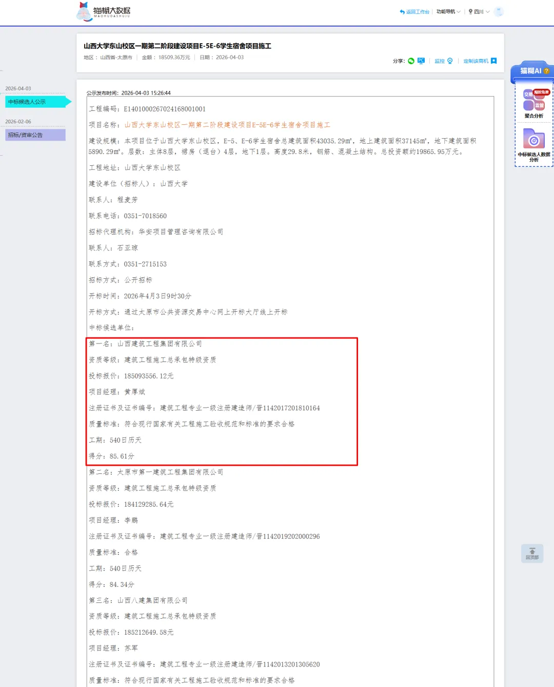 该项目于3月4日正式开标,共有3家投标人参与投标。最终由山西建筑工程集团有限公司以1.8509亿元成功中标,项目计划工期为540个日历天。