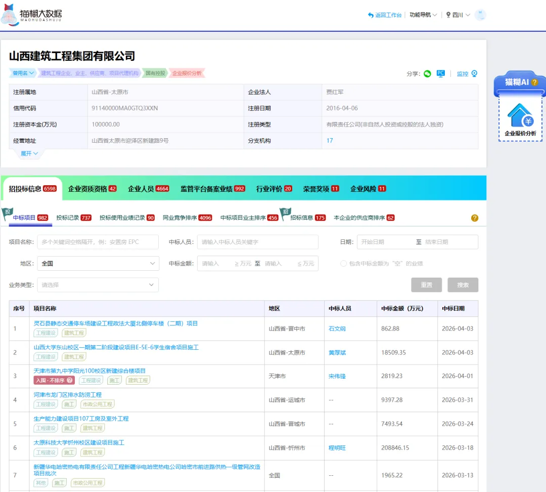如果您想全面了解该中标人的中标记录,可以通过猫糊平台的“企业查询”来查看该企业所有的中标项目列表。
