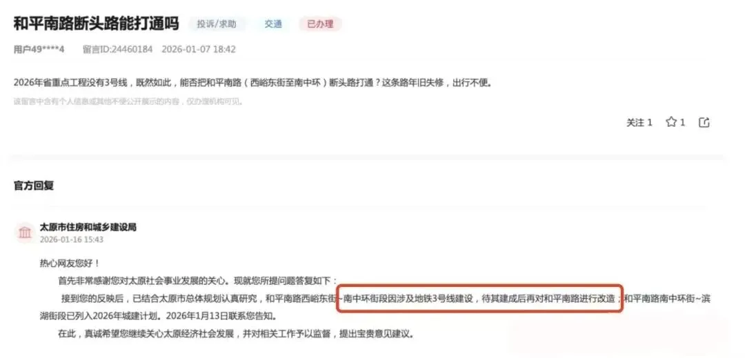 2、高层十分重视和平路的修建和改造,南延后将彻底打通晋源区文旅区,利好周边居民出行和太原市文旅产业的发展。