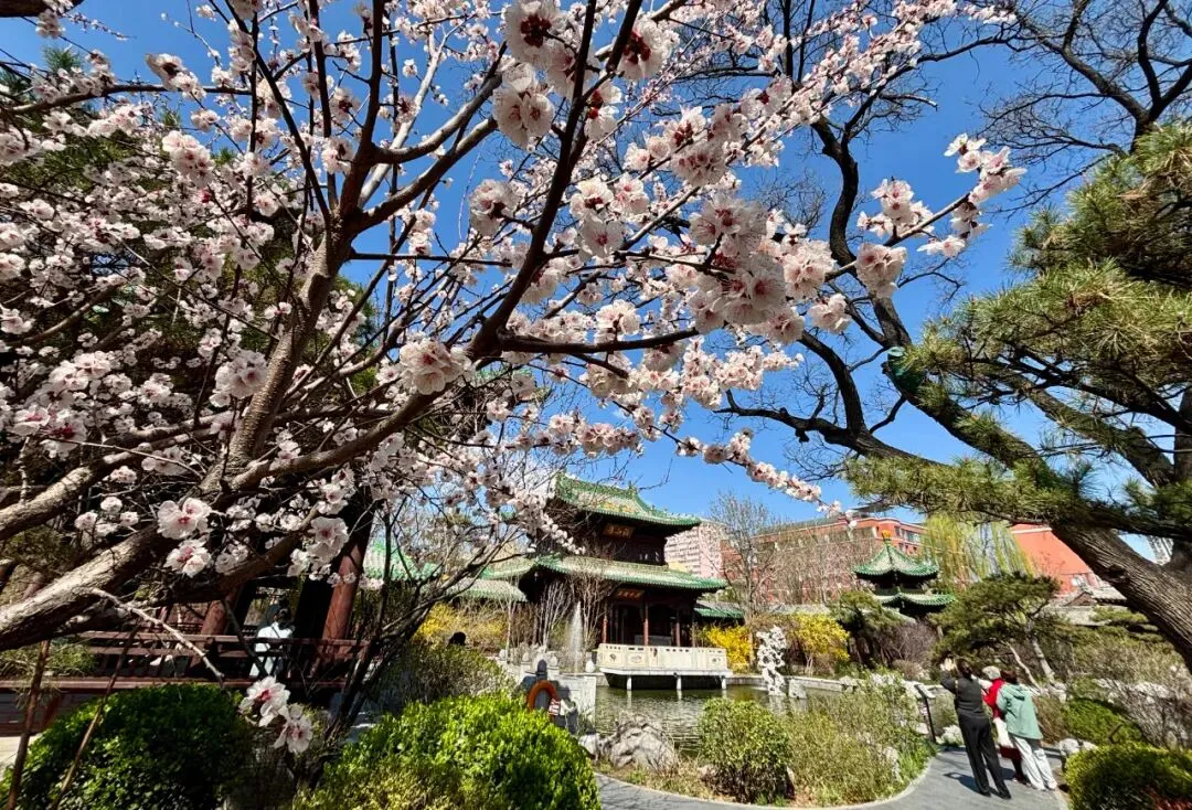 双塔公园的凌霄双塔矗立了数百年。登高望去,太原的春日美景藏在这古建与繁花里。