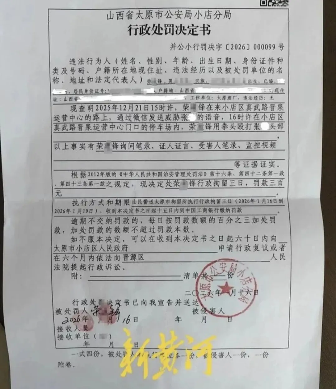 此后太原市公安局小店分局对荣某锋作出行政处罚决定书,决定对荣某锋行政拘留3日,罚款300元。